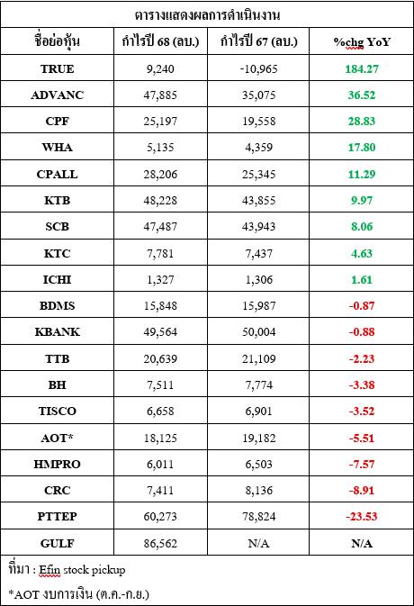 บมจ.จริญโภคภัณฑ์อาหาร (CPF) ผลการดำเนินงานปี 2568 มีกำไรสุทธิ 25,197 ล้านบาท เติบโตขึ้น 28.83% จากปีก่อน, บมจ.ดับบลิวเอชเอ คอร์ปอเรชั่น (WHA) ผลการดำเนินงานปี 2568 มีกำไรสุทธิ 5,135 ล้านบาท เติบโตขึ้น 17.80% จากปีก่อน และ บมจ.ซีพี ออลล์ (CPALL) ผลการดำเนินงานปี 2568 มีกำไรสุทธิ 28,206 ล้านบาท เติบโตขึ้น 11.29% จากปีก่อน