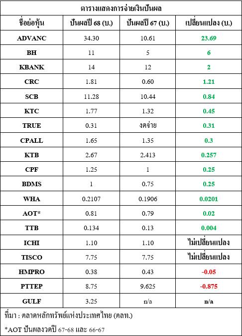 ต่อด้วย ธนาคารกสิกรไทย (KBANK) ที่ผลการดำเนินงานงวดปี 2568 จ่ายเงินปันผล 14 บาท/หุ้น เทียบกับปี 2567 จ่ายเงินปันผลรวม 12 บาท/หุ้น คิดเป็นการจ่ายเงินปันผลเพิ่มขึ้น 2 บาท/หุ้น และ บมจ.เซ็นทรัล รีเทล คอร์ปอเรชั่น (CRC) ที่ผลการดำเนินงานงวดปี 2568 จ่ายเงินปันผล 1.81 บาท/หุ้น เทียบกับปี 2567 จ่ายเงินปันผลรวม 0.60 บาท/หุ้น คิดเป็นการจ่ายเงินปันผลเพิ่มขึ้น 1.21 บาท/หุ้น