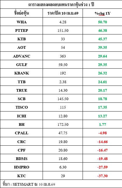 มีอีก 7 บริษัท ที่ผลตอบแทนราคาหุ้นช่วง 1 ปีที่ผ่านมา ปรับตัวขึ้นมากกว่า 20% นำโดย ธนาคารกรุงไทย (KTB) ที่ผลตอบแทนราคาหุ้นปรับตัวขึ้น 45.37%, บมจ.ท่าอากาศยานไทย (AOT) ผลตอบแทนราคาหุ้นปรับตัวขึ้น 39.35%, บมจ.แอดวานซ์ อินโฟร์ เซอร์วิส (ADVANC) ผลตอบแทนราคาหุ้นปรับตัวขึ้น 29.64%