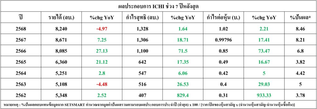 สิ่งที่น่าสนใจคือตั้งแต่ปี 2562-68 หรือ 7 ปีที่ผ่านมา กำไรสุทธิของ ICHI เติบโตทุกปี เป็นเพียงบริษัทจดทะเบียน (บจ.) หนึ่งเดียวของตลาดหุ้นไทย ที่เพิ่มขึ้นต่อเนื่อง ผ่านทั้งวิกฤติโควิด-19, การเมืองในประเทศ, สงครามการค้า และ ปัญหาภูมิรัฐศาสตร์ในยุโรป จนถึงตะวันออกกลางล่าสุด