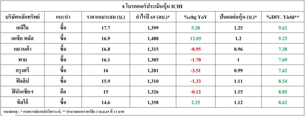 ทั้งนี้เมื่อสำรวจข้อมูลจากบทวิเคราะห์ พบว่า คาดการณ์เงินปันผลต่อหุ้นของ ICHI สำหรับงวดปี 69 จะอยู่ที่ 0.99-1.25 บาท คิดเป็น Div. Yield ณ ราคาปิด 4 เม.ย.69 ที่ 13 บาท สูงถึงเฉลี่ย 8.44% หรือ 7.38-9.62%