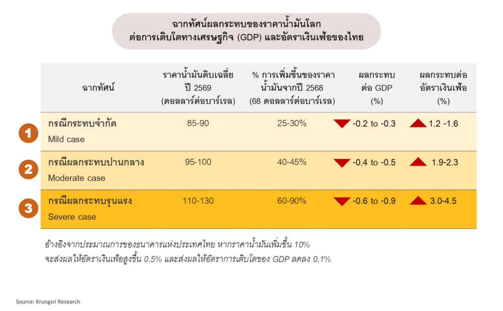 ส่วนในกรณีเลวร้าย หากราคาน้ำมันเฉลี่ยทั้งปีปรับเพิ่มขึ้นสู่ระดับ 110-130 ดอลลาร์สหรัฐต่อบาร์เรล และภาครัฐไม่สามารถอุดหนุนราคาพลังงานและค่าครองชีพภายในประเทศได้ เงินเฟ้อในประเทศจะเร่งตัวขึ้นอย่างมากถึงราว 3.0-4.5% จากกรณีฐาน และอาจทำให้ GDP ของไทยลดลงจากกรณีฐานถึงประมาณ -0.6 ถึง -0.9% โดย “วิจัยกรุงศรี” คาดการณ์ไว้ที่ 2% (ณ 26 ก.พ.2569)