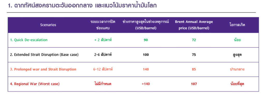 หากสถานการณ์ความขัดแย้งลุกลามสู่สงครามระดับภูมิภาค (Regional war) การขนส่งพลังงานทั้งภูมิภาคหยุดชะงัก ราคาน้ำมัน Brent เฉลี่ยจะปรับเพิ่มขึ้นมากไปที่ 107 ดอลลาร์ต่อบาร์เรล