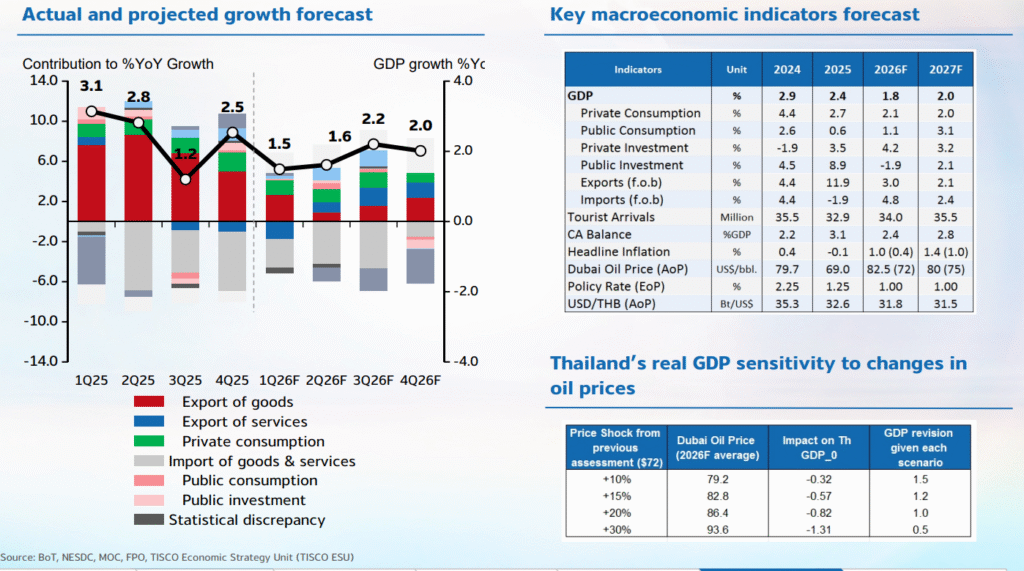 ศูนย์วิเคราะห์เศรษฐกิจและกลยุทธ์ทิสโก้ (TISCO Economic Strategy Unit) ระบุว่า แม้ภาพรวมเศรษฐกิจไทยในปีนี้มีแนวโน้มเติบโตที่ 1.8% จากแรงหนุนจากการฟื้นตัวของการลงทุนภาคเอกชนในช่วงปลายปีก่อน ตามมาตรการ Fast-pass ของภาครัฐและผลกระทบจากมาตรการภาษีสหรัฐฯ ที่น้อยกว่าคาด
