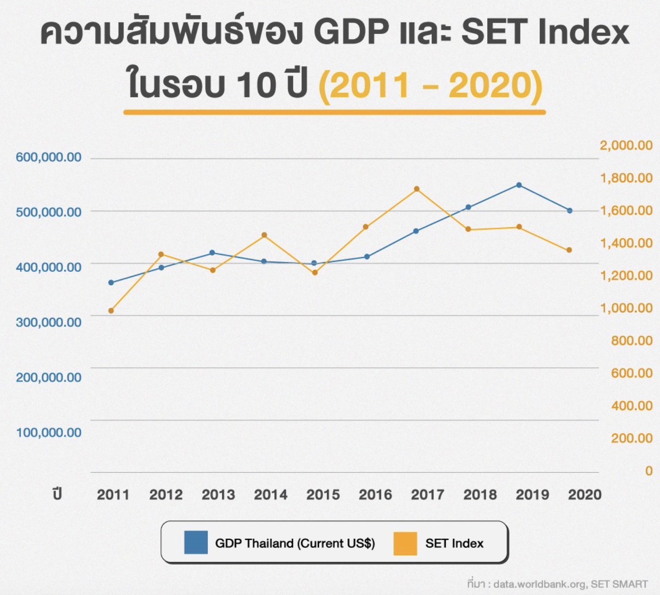 - GDP และตลาดหุ้นไทยมีความสัมพันธ์ไปในทิศทางเดียวกัน กล่าวคือ การเติบโตของ GDP มักจะส่งผลให้ดัชนีตลาดหุ้นเพิ่มขึ้น เนื่องจากบริษัทต่าง ๆ มักจะมีกำไรที่สูงขึ้นในช่วงที่เศรษฐกิจขยายตัว ราคาหุ้นของบริษัทเหล่านี้มักจะปรับตัวสูงขึ้นตามไปด้วย แต่ในช่วงที่ GDP เติบโตช้า ดัชนี SET อาจมีแนวโน้มผันผวนหรือปรับตัวลง