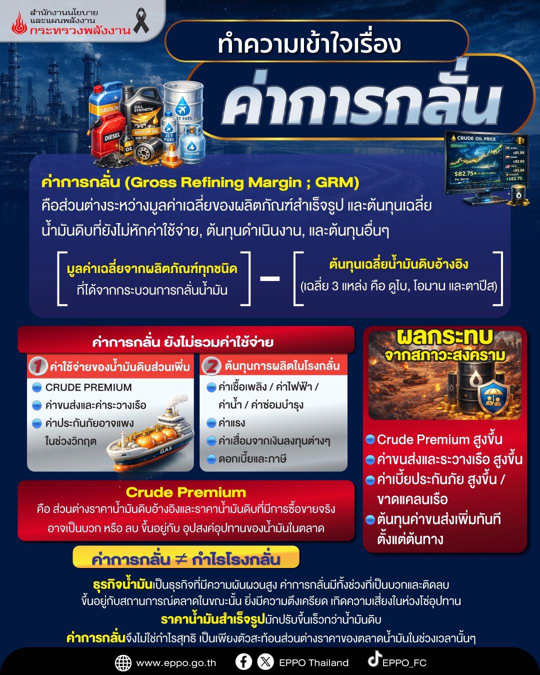 - War Premium (ค่าพรีเมียมความเสี่ยงสงคราม): ในภาวะวิกฤตการณ์โลก โรงกลั่นต้องจ่าย “ค่าความเสี่ยง” เพิ่มเติม ทั้งค่าขนส่งทางเรือที่แพงขึ้น ค่าประกันภัย และส่วนต่างราคาน้ำมันดิบจริงที่สูงกว่าราคาอ้างอิงตลาดโลก ซึ่ง คตร. ระบุว่าแม้จะหักค่าเหล่านี้แล้ว โรงกลั่นก็ยังมี “กำไรส่วนเกิน” หลงเหลืออยู่มากเกินปกติ