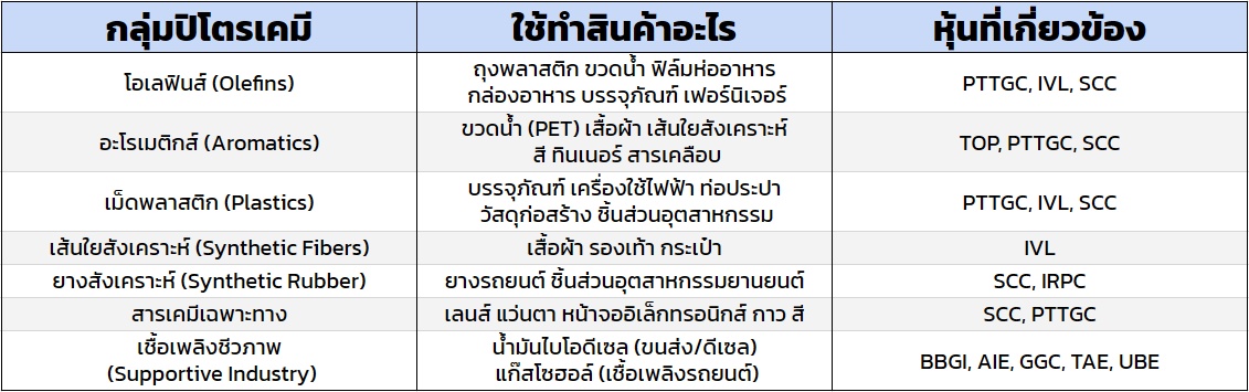 ขณะเดียวกัน เมื่อเชื่อมโยงกลับมาที่ตลาดหุ้นไทย จะพบว่าบริษัทขนาดใหญ่หลายแห่งล้วนอยู่ในห่วงโซ่คุณค่านี้ ตั้งแต่ต้นน้ำ กลางน้ำ ไปจนถึงปลายน้ำ รวมถึงพลังงานทางเลือกที่กำลังเข้ามามีบทบาทมากขึ้นในอนาคต
