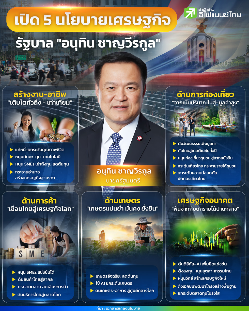 รัฐบาลภายใต้การนำของ “นายอนุทิน ชาญวีรกูล” นายกรัฐมนตรี และรัฐมนตรีว่าการกระทรวงกลาโหม เดินหน้าเปิด 5 นโยบายเศรษฐกิจหลัก ต่อรัฐสภา โดยมุ่งขับเคลื่อนประเทศสู่การเติบโตอย่างยั่งยืน ยกระดับขีดความสามารถการแข่งขัน และกระจายโอกาสทางเศรษฐกิจสู่ทุกภาคส่วนอย่างทั่วถึง