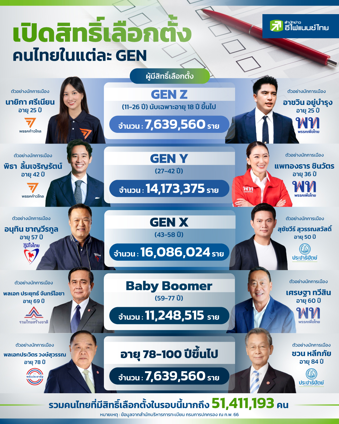 ในวันที่ 14 พ.ค. นี้ จะเป็นวันที่ผู้ที่มีอายุครบ 18 ปีบริบูรณ์ ได้ออกไปใช้สิทธิ์เลือกตั้งกันอีกครั้ง หลังจากล่าสุด รัฐบาลภายใต้แกนนำ พลเอกประยุทธ์จันทร์โอชา นายกรัฐมนตรีและรัฐมนตรีว่าการกระทรวงกลาโหม ได้ประกาศยุบสภาเมื่อไม่กี่วันที่ผ่านมา โดยช่วงนี้น่าจะเริ่มได้เห็นพรรคการเมืองต่างๆ ออกมาหาเสียง โปรโมทนโยบายพรรคการอย่างเต็มที่ รวมถึงบางพรรคเริ่มที่จะเปิดตัวทีมเศรษฐกิจให้ประชาชนได้รับทราบกัน และก่อนที่จะไปถึงวันเลือกตั้ง "สำนักข่าวอีไฟแนนซ์ไทย" ได้ทำการสำรวจข้อมูลประชากร จากกรมการปกครองว่า
