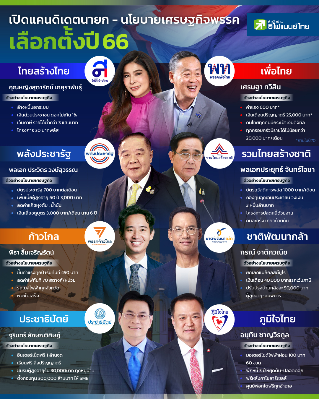ในที่สุดก็เข้าสู่การเลือกตั้งอย่างเป็นทางการ หลังจากวานนี้ราชกิจจานุเบกษาได้ลงประกาศการยุบสภาผู้แทนราษฎรปี 2566 นั่นถือเป็นสัญญาณชัดเจนว่าคนไทยจะได้เลือกตั้งแน่นอนแล้วในปีนี้ และแน่นอนว่า พรรคการเมืองต่างๆ จะเริ่มโปรโมทนโยบายที่หวังจะได้ครองเสียงข้างมากจัดตั้งรัฐบาลกันอย่างอึกทึก แต่ในช่วงที่ผ่านมาหลายท่านคงได้เห็นป้ายหาเสียงกันตามท้องถนนมาบ้างแล้ว โดยเฉพาะการชูนโยบายที่เกี่ยวข้องกับปากท้องของประชาชน และนอกจากนโยบายป้ายหาเสียงแล้ว ที่น่าจับตามองนั่นก็คือ “แคนดิเดต” นายกรัฐมนตรีคนใหม่นั่นเอง