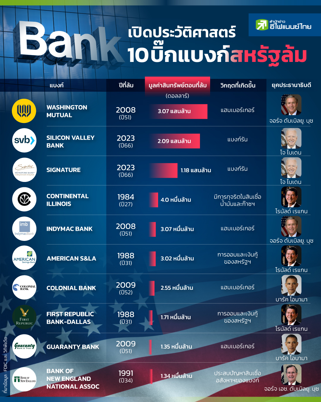 ปัจจุบันความเชื่อมั่นที่มีต่อระบบภาคธนาคารได้ถูกสั่นคลอนไปทั่วโลก หลังธนาคารซิลิคอนวัลเลย์และธนาคารซิกเนเจอร์ในประเทศสหรัฐฯเกิดสภาวะล่มสลาย เพราะปัญหาสภาพคล่อง รวมไปถึงธนาคารเครดิต สวิส (Credit Suisse) ที่ถูกเทคโอเวอร์โดยคู่แข่งอย่างธนาคาร UBS แต่รู้หรือไม่ว่าหากนับย้อนหลังไปในรอบหลายสิบปีโลกได้เผชิญกับวิกฤตการณ์ทางการเงิน ซึ่งสั่นสะเทือนเศรษฐกิจทั่วโลกมาแล้วหลายครั้ง ทั้งนี้ "สำนักข่าวอีไฟแนนซ์ไทย" จึงได้ดำเนินการรวบรวมประวัติศาสตร์ 10 บิ๊กแบงก์สหรัฐ ที่เกิดสภาวะล้มละลายในช่วงวิกฤตการณ์ทางการเงินในรอบหลายปีที่ผ่านมา