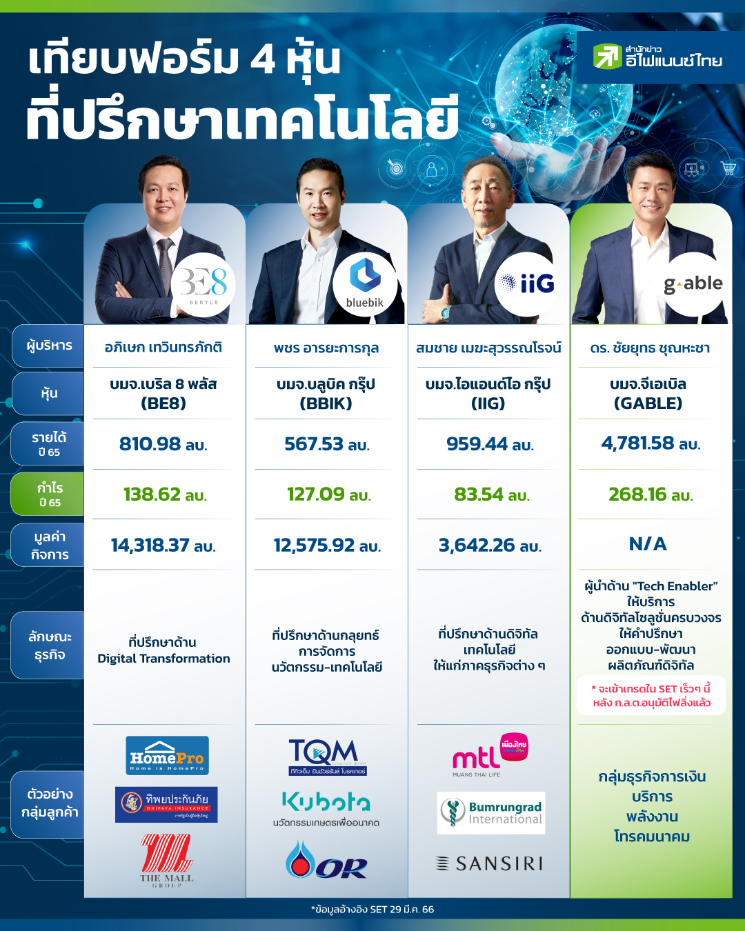 ปัจจุบันการทำธุรกิจต้องใช้เทคโนโลยีสมัยใหม่เข้าช่วยบริหารจัดการ ทั้งระบบหน้าบ้านและหลังบ้าน เพื่อการดำเนินธุรกิจให้ง่ายและคล่องตัวรองรับการเติบโตในอนาคต ซึ่งหลายบริษัทฯ ต้องใช้บริการขอคำปรึกษาจากผู้ที่มีความเชี่ยวชาญด้านดังกล่าว โดยปัจจุบันมีบริษัทจดทะเบียนในตลาดหุ้นไทยหลายรายที่เป็นผู้ให้คำปรึกษาด้านเทคโนโลยี-ดิจิทัล ที่ครอบคลุมความต้องการของลูกค้า สำนักข่าว "อีไฟแนนซ์ไทย" จึงได้รวบรวมข้อมูลหุ้นที่ทำธุรกิจให้คำปรึกษาเทคโนโลยีบางส่วนทั้ง BE8 , BBIK และ IIG รวมถึงหุ้นน้องใหม่ไอพีโอที่เตรียมจะเข้าจดทะเบียนในตลาดหลักทรัพย์เร็วๆ