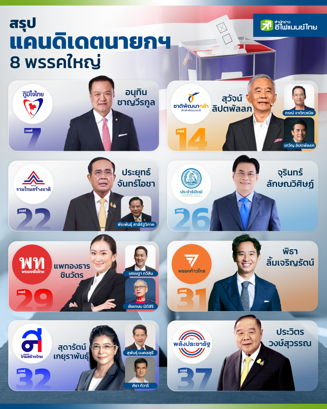 เหลืออีกเพียงเดือนเศษฯเท่านั้น ก็จะถึงวันเลือกตั้งสมาชิกสภาผู้แทนราษฎรปี 2566 ซึ่งถือเป็นอีกครั้งประวัติศาสตร์ที่การเลือกตั้งคึกคักมาก โดยการสมัครสมาชิกที่เริ่มขึ้นเมื่อไม่กี่วันที่ผ่านมา พบทั้ง นักการเมืองอาวุโส ที่ลงสนามมานาน และหน้าใหม่ที่เพิ่งชิมลางเล่นการเมืองเป็นปีแรก แต่ที่น่าจับตามอง นั่นก็คือ แคนดิเดตนายกรัฐมนตรี ซึ่งพรรคการเมืองขนาดใหญ่ ที่เป็นตัวเต็งในการจัดตั้งรัฐบาลชุดใหม่ ก็ได้เปิดโฉมหน้าแคนดิเดตฯ นายกออกมากันจนครบแล้ว ซึ่งบางพรรคก็มีแคนดิเดต เพียงคนเดียว แต่ก็มีอีกหลายพรรคที่ยื่นชื่อต่อคณะกรรมการการเลือกตั้ง