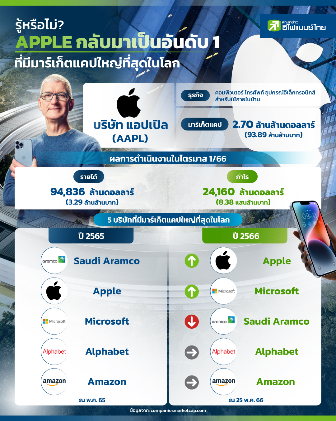 ในช่วงเดือน พ.ค. 65 พบว่า Saudi Aramco บริษัทน้ำมันยักษ์ใหญ่ของซาอุดิอาระเบีย กลายเป็นบริษัทที่มีมูลค่าสูงที่สุดในโลก หลังมีมูลค่าตามราคาตลาด (Market Cap) เพิ่มขึ้นเป็น 2.43 ล้านล้านดอลลาร์ แซงหน้า Apple Inc. ซึ่งเป็นเจ้าของสถิติเดิมที่มีมูลค่าตามราคาตลาดลดลงมาอยู่ที่ 2.37 ล้านล้านดอลลาร์ หลังราคาหุ้นของ Apple ลดลงมากกว่า 5% แต่ก็เป็นเพียงช่วงเวลาสั้นๆเท่านั้น ที่ Saudi Aramco ได้นั่งแท่นอันดับ 1 หลังจากนั้นไม่นาน Apple ก็กลับไปทวงคืนตำแหน่งกลับมาอีกครั้ง และปัจจุบันก็ยังคงนั่งแท่นอันดับ 1 บริษัทที่มีมาร์เก็ตแคปใหญ่ที่สุดในโลกอยู่