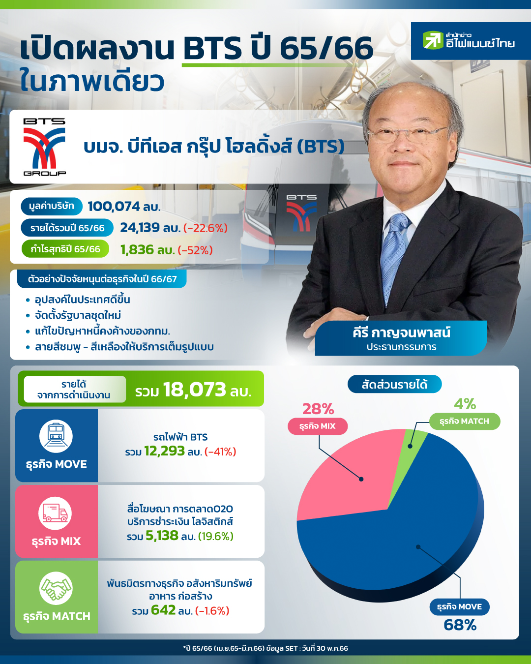 เป็นบริษัทจดทะเบียนในตลาดหุ้นที่รอบบัญชีแตกต่างจากบริษัทอื่นๆ สำหรับ บมจ. บีทีเอส กรุ๊ป โฮลดิ้งส์ (BTS)ที่ล่าสุด เปิดเผยงบประจำปี 65/66 (เม.ย.65 - มี.ค.66) ซึ่งปีนี้มีกำไร 1,836 ล้านบาท ลดลง 52% ส่วนรายได้รวม24,139 ล้านบาท ลดลง 22.6%เมื่อเทียบกับช่วงเดียวกันปีก่อน เนื่องจากรายได้จากบริการรับเหมาของโครงการรถไฟฟ้าสายสีชมพูและสีเหลืองลดลง เพราะอยู่ในช่วงท้ายโครงการ ประกอบกับการเพิ่มขึ้นของค่าใช้จ่ายในการขายและบริหารซึ่งเป็นผลจากการขยายธุรกิจ และการเข้าควบรวมบริษัทย่อยต่างๆ ของวีจีไอ โดยสำนักข่าว "อีไฟแนนซ์ไทย"