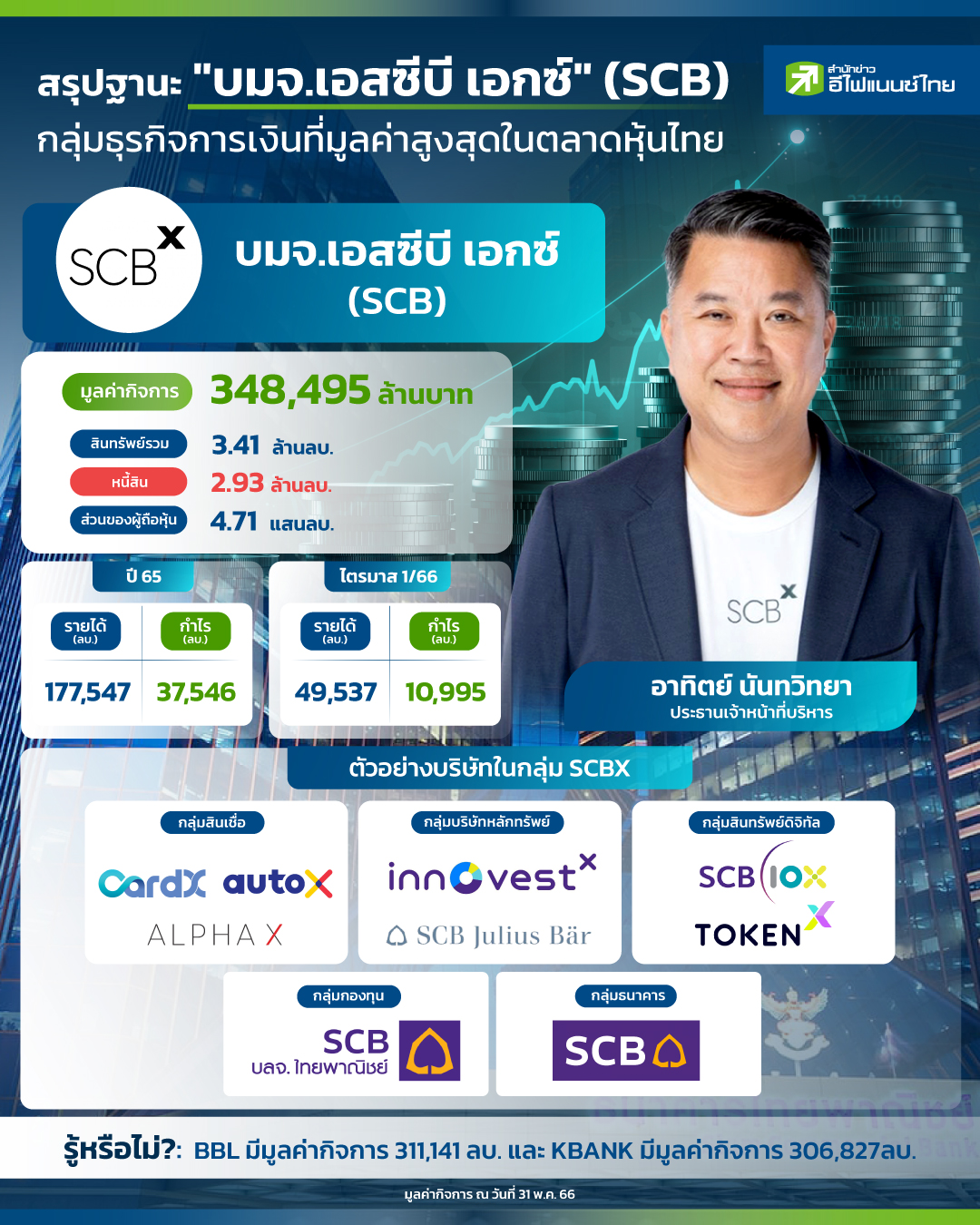 บมจ.เอสซีบี เอกซ์ หรือ SCBX ที่เป็นมากกว่าธนาคาร โดยปัจจุบัน กลายเป็นกลุ่มธุรกิจการเงินที่มีมูลค่าสูงสุดในตลาดหุ้นไทย โดยมีมูลค่ากิจการอยู่ที่ 348,495 ล้านบาท ณ วันที่ 31 พ.ค. ที่ผ่านมา และปัจจุบันมีสินทรัพย์รวมมากกว่า 3.41 ล้านล้านบาท แซงหน้า ธนาคารกรุงเทพ และธนาคารกสิกรไทยไปแล้ว โดยในวันนี้ “สำนักข่าวอีไฟแนนซ์ไทย” ได้นำข้อมูล ทั้งมูลค่ากิจการ สินทรัพย์รวม หนี้สิน รวมถึงผลประกอบการของทั้งปี 65 และไตรมาสแรกที่ผ่านมา มาให้นักลงทุนได้ติดตามกัน รวมถึงตัวอย่างบริษัทในกลุ่ม SCBX ด้วยว่าปัจจุบัน