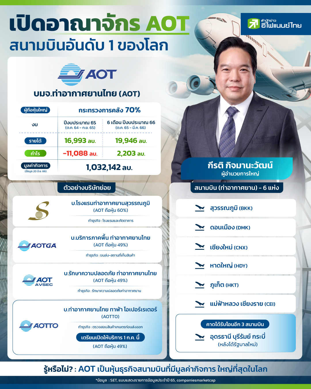 บมจ.ท่าอากาศยานไทย (AOT)ถือเป็นรัฐวิสาหกิจ ในสังกัดกระทรวงคมนาคม ทำหน้าที่บริหารงานท่าอากาศยานระดับชาติของประเทศ ซึ่งหากนับรวมเกี่ยวกับธุรกิจการบินถือว่าเป็นบริษัทที่มีมูลค่ากิจการใหญ่ที่สุดในโลก คิดเป็น 1.03 ล้านล้านบาท (ข้อมูลล่าสุด 20 มิ.ย.66) ปัจจุบันบริษัทฯ มีสนามบินในการบริหาร 6 แห่งด้วยกัน และอยู่ระหว่างดำเนินการเพื่อเตรียมรับโอนสิทธิบริหารสนามบินอีก 3 แห่ง จากกรมท่าอากาศยาน นอกจากธุรกิจหลักในการบริหารสนามบินแล้ว AOT ยังมีธุรกิจในเครือ ซึ่งเป็นธุรกิจที่เกี่ยวข้องกับการบริหารสนามบิน ทั้งโรงแรม