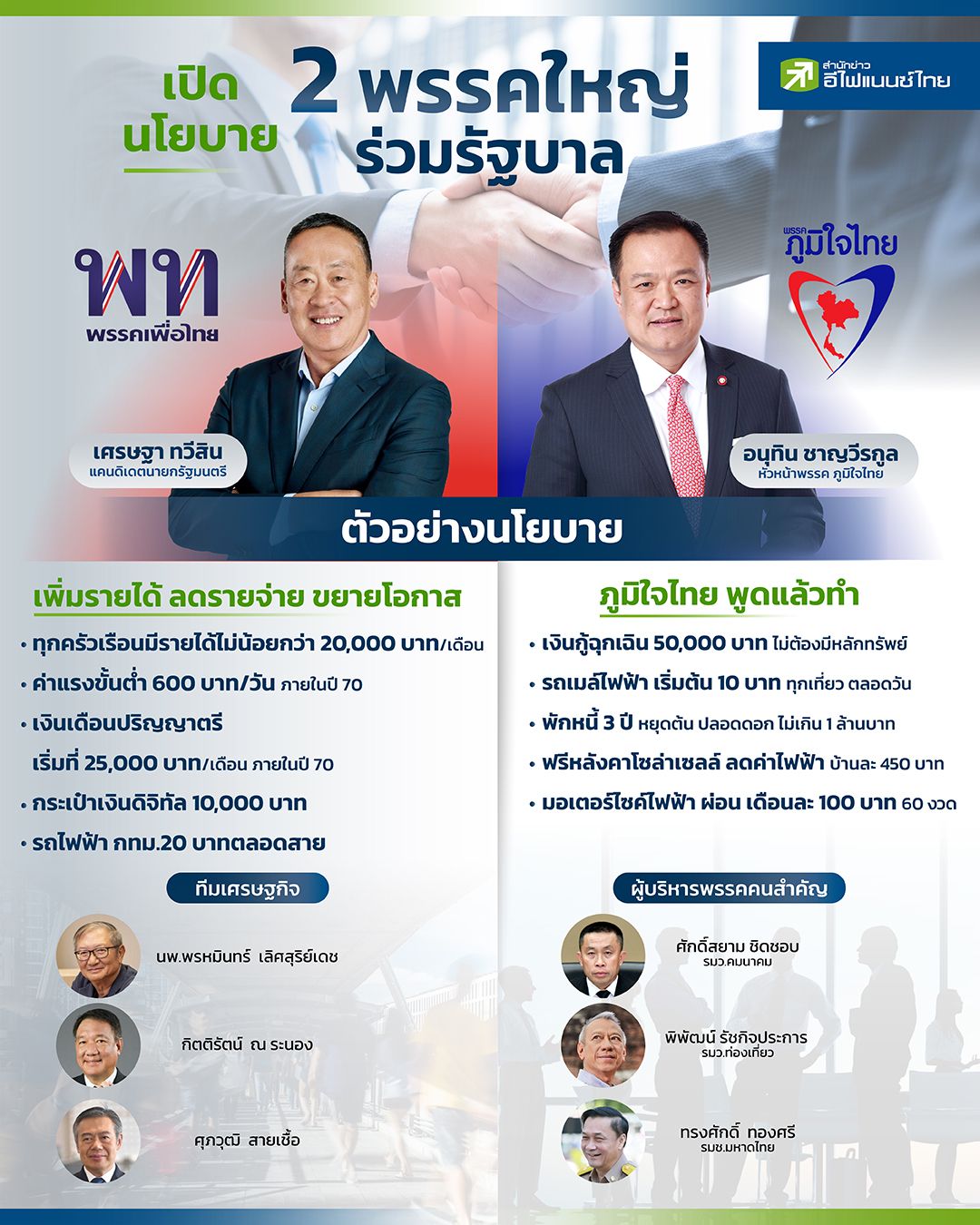 เป็นที่แน่นอนแล้วว่า การจัดตั้งรัฐบาลใหม่จากนี้จะเป็นหน้าที่ของ 2 พรรคใหญ่ อย่าง พรรคเพื่อไทย และพรรคภูมิใจไทย หลังจากทั้ง 2 พรรคประกาศจับมืออย่างเป็นทางการ ด้วยการมี 212 เสียง เป็นเสียงตั้งต้นในการโหวตนายกรัฐมนตรี ในรอบ 3 ซึ่งหากไม่มีอะไรผิดพลาด ทั้ง 2 พรรค จะชู “เศรษฐา ทวีสิน” เป็นนายกรัฐมนตรี และเดินหน้าจัดตั้งรัฐบาลภายในเดือนก.ย.นี้ “สำนักข่าวอีไฟแนนซ์ไทย” จึงได้ทำการรวบรวมนโยบายเศรษฐกิจทั้ง 2 พรรค มาให้ดูกันอีกครั้ง พร้อมทั้งโฉมหน้าทีมเศรษฐกิจบางส่วนจากพรรคเพื่อไทย และ