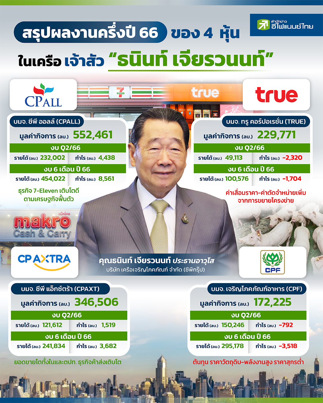 หากพูดถึงธุรกิจอุปโภค-บริโภครายใหญ่ในประเทศไทย หลายคนคงนึกถึงธุรกิจในเครือ บริษัท เครือเจริญโภคภัณฑ์ จำกัด (ซีพีกรุ๊ป) ของมหาเศรษฐ๊เบอร์ต้นของไทย อย่าง "ธนินท์ เจียรวนนท์" ซึ่งปัจจุบัน บริษัทในกลุ่ม ซีพีกรุ๊ป ได้เข้าจดทะเบียนในตลาดหลักทรัพย์ทั้งสิ้น 4 บริษัทด้วยกัน ไม่ว่าจะเป็น บมจ. ซีพี ออลล์ (CPALL) ผู้ทำธุรกิจร้านสะดวกซื้อ 7-eleven , บมจ. เจริญโภคภัณฑ์อาหาร (CPF) ผู้ผลิตอาหารสด - แปรรูปเบอร์ 1 ของไทย , บมจ. ซีพี แอ็กซ์ตร้า (CPAXT) ผู้ทำธุรกิจค้าส่งอย่าง MAKRO และ ค้าปลีกสมัยใหม่อย่าง