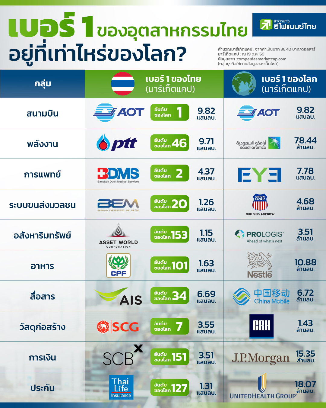 ปัจจุบัน ทั่วโลกมีบริษัทที่จดทะเบียนอยู่ในตลาดหลักทรัพย์ของแต่ละประเทศเป็นจำนวนมาก โดยหลากหลายบริษัทมีชื่อเสียง และเป็นบริษัทชั้นนำที่หลายคนน่าจะรู้จักกันดี ไม่ว่าจะเป็น Saudi Aramco ซึ่งเป็นบริษัทขุดเจาะน้ำมันที่มีมูลค่าตลาด ส่วนแบ่งการตลาด และกำลังการผลิตที่สูงที่สุดในโลก หรือ แม้แต่ บมจ.ท่าอากาศยานไทย (AOT) ของไทย ที่มีมาร์เก็ตแคปที่ใหญ่ที่สุดเป็นอันดับ 1 ของโลก ในหมวดหมู่ท่าอากาศยาน โดยในวันนี้ “สำนักข่าวอีไฟแนนซ์ไทย” ได้ทำการรวบรวม บริษัทที่มีมาร์เก็ตแคปที่ใหญ่ที่สุดเป็นอันดับ 1