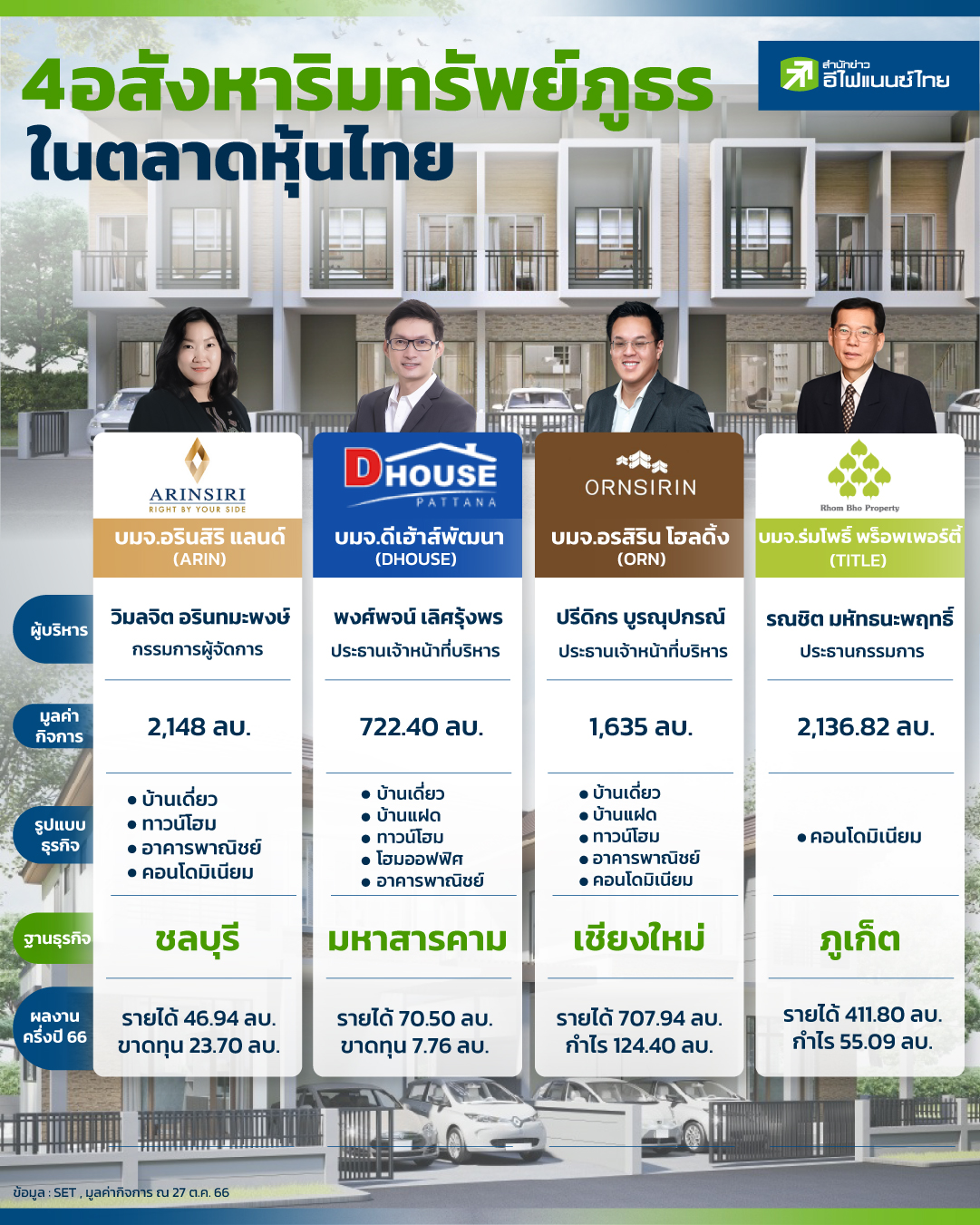 บริษัทจดทะเบียนในตลาดหุ้นไทยกลุ่มอสังหาริมทรัพย์ ล่าสุดมีสมาชิกใหม่ เมื่อวันที่ 30 ต.ค.66 ที่ผ่านมา มีบริษัทอสังหาริมทรัพย์น้องใหม่อย่าง บมจ.อรสิริน โฮลดิ้ง (ORN) เข้าซื้อขายในตลาดหุ้นเป็นวันแรก จุดเด่นของ ORN คือเป็นผู้นำอสังหาริมทรัพย์ชั้นนำในจังหวัดเชียงใหม่ ซึ่ง ORN ไม่ได้เป็นบริษัทอสังหาริมทรัพย์ในต่างจังหวัดรายแรกในตลาดหุ้นไทย เพราะก่อนหน้านี้มีหลายบริษัทเข้ามาระดมทุนมาแล้ว โดย "สำนักข่าวอีไฟแนนซ์ไทย" จึงได้นำข้อมูลผู้ประกอบการอสังหาริมทรัพย์ในตลาดต่างจังหวัด พบว่ามีอีก 3 บริษัทได้แก่