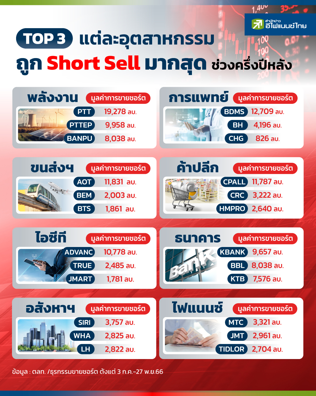 กระแสการทำธุรกรรมการขายชอร์ต (Short Sell) ในช่วงนี้ ค่อนข้างร้อนแรง หลังจากที่ถูกกล่าวหา ว่าการทำ Short Sell เป็นตัวการที่ทำให้หุ้นไทยลดลงอย่างหนักในช่วงนี้ แม้ว่าตลาดหลักทรัพย์แห่งประเทศไทย(ตลท.) จะเรียกความเชื่อมั่น โดยการยกระดับมาตรการกำกับดูแลตลาดหุ้น สั่งโบรกเกอร์ส่งหลักฐานเพื่อตรวจหาการทำ Naked Short Selling รวมไปถึงการเปิดเผยข้อมูลการซื้อขายหุ้นผ่านโปรแกรมเทรดแบบรายวันแล้วก็ตาม "สำนักข่าวอีไฟแนนซ์ไทย" จึงได้สำรวจหุ้นที่ถูก Short Sell ในช่วงครึ่งหลังปี 66 ว่า พบหุ้นบมจ.ปตท. (PTT)