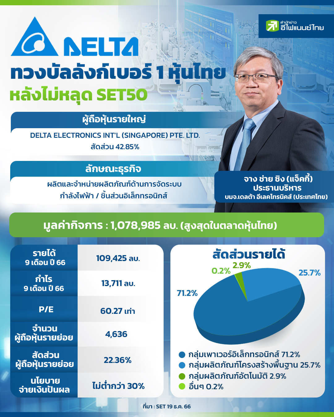 หลังจากประกาศรายชื่อหุ้นที่ใช้คำนวณดัชนี SET50 และ SET100 งวดครึ่งแรกปี 67 พบว่าหุ้นเดลต้า อีเลคโทรนิคส์ (ประเทศไทย) หรือ DELTA ยังคงอยู่ในดัชนีฯ SET50 พร้อมทั้งสามารถพลิกกลับมาเป็นหุ้นที่มีมูลค่าการซื้อขายเป็นอันดับ 1 ในตลาดหุ้นไทยได้อีกครั้ง จากก่อนหน้านี้ที่เจอหุ้นบมจ.ปตท.แซงหน้าชั่วคราว "สำนักข่าวอีไฟแนนซ์ไทย" จึงได้รวบรวมข้อมูลธุรกิจ DELTA เบอร์ 1 หุ้นไทย ทั้ง ลักษณะธุรกิจ ผลประกอบการ จำนวนผู้ถือหุ้นรายย่อย และสัดส่วนรายได้ รายละเอียดดังนี้