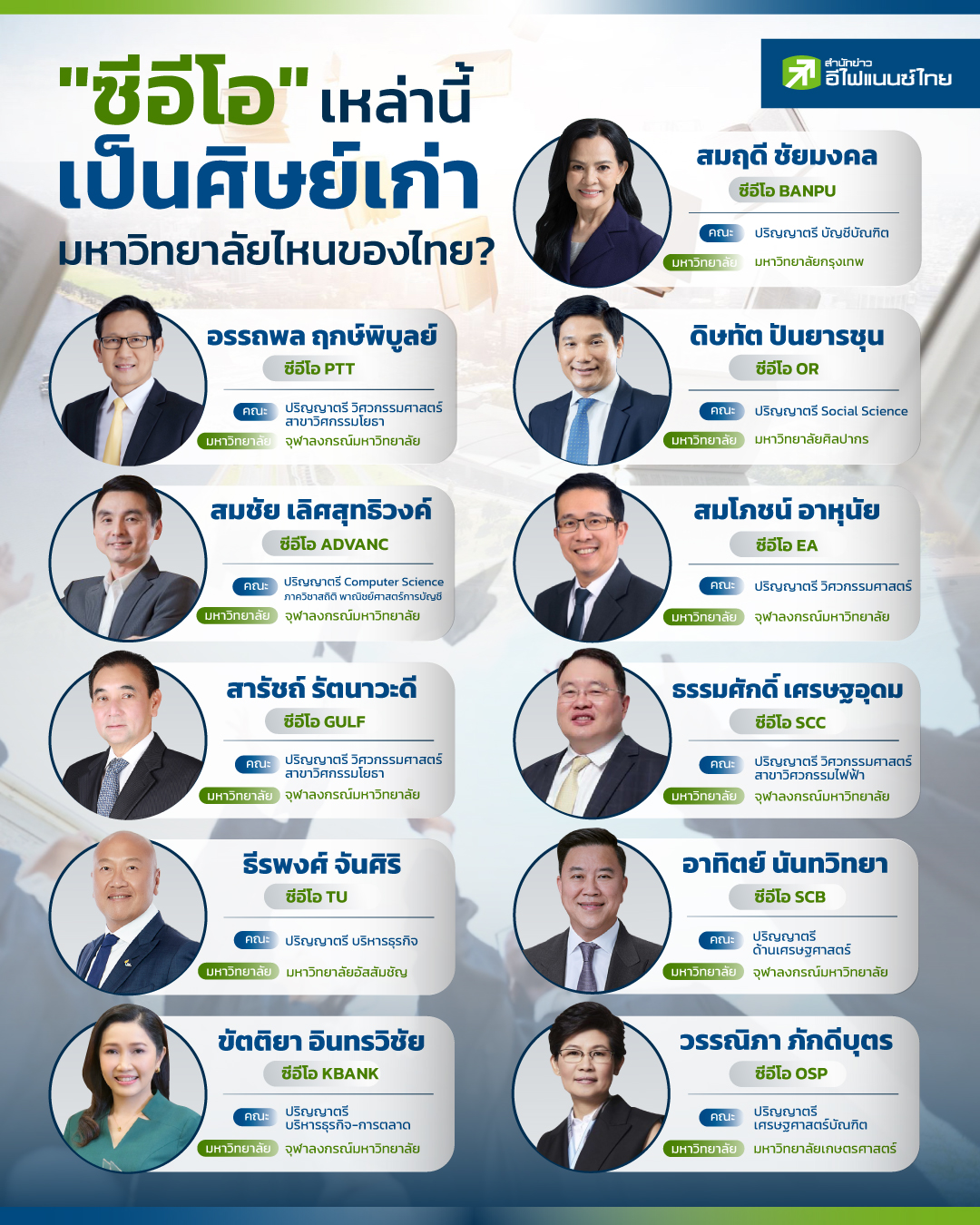 หลายต่อหลายคนที่สำเร็จการศึกษา บางคนอาจได้ทำงานในสายงานตรง หรือ สายงานที่ได้ร่ำเรียนมา แต่ก็ต้องบอกว่า มีจำนวนไม่น้อย ที่สาขาที่เรียนมานั้น อาจไม่ได้ตรงกับการทำงานในปัจจุบัน และประสบความสำเร็จในการบริหารงานเป็นจำนวนมากด้วย ขณะเดียวกัน ยังพบว่า บรรดาผู้บริหารมือทองทั้งหลาย ล้วนจบการศึกษาระดับปริญญาตรีในประเทศไทยทั้งสิ้น โดยในวันนี้ "สำนักข่าวอีไฟแนนซ์ไทย" ได้ทำการรวบรวม บรรดา ซีอีโอของไทย ว่า ในช่วงชั้นระดับปริญญาตรีนั้น ผู้บริหารเหล่านี้ จบจากรั้วมหาวิทยาลัยไหนกันบ้าง