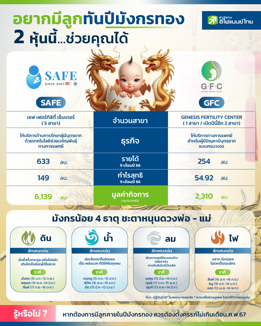 ในปัจจุบันคนไทยหลายคนมีความเชื่อเรื่องโชคชะตา การเสริมดวงในด้านต่างๆเป็นอย่างมาก โดยเฉพาะคุณพ่อคุณแม่มือใหม่หลายๆคนที่อาจมีความเชื่อเรื่องมงคลให้กับลูก อาทิ การหาฤกษ์วันคลอดเพื่อเป็นสิริมงคลให้กับลูกและครอบครัว โดยในปีนี้จะเป็นปีมังกรหรือปีมะโรง ซึ่งตามคติความเชื่อของชาวจีนยกให้ปีมังกรเป็นปีมงคลที่สุด จึงทำให้ว่าที่คุณพ่อคุณแม่ที่กำลังแพลนจะมีลูกน้อยไม่ควรพลาดปีมงคลนี้ เพราะ 12 ปีถึงจะวนมาครั้งหนึ่ง ทั้งนี้ “สำนักข่าวอีไฟแนนซ์ไทย” จึงได้รวบรวมข้อมูล 2 หุ้น ผู้นำให้บริการทางการแพทย์สำหรับผู้มีปัญหามีบุตรยาก