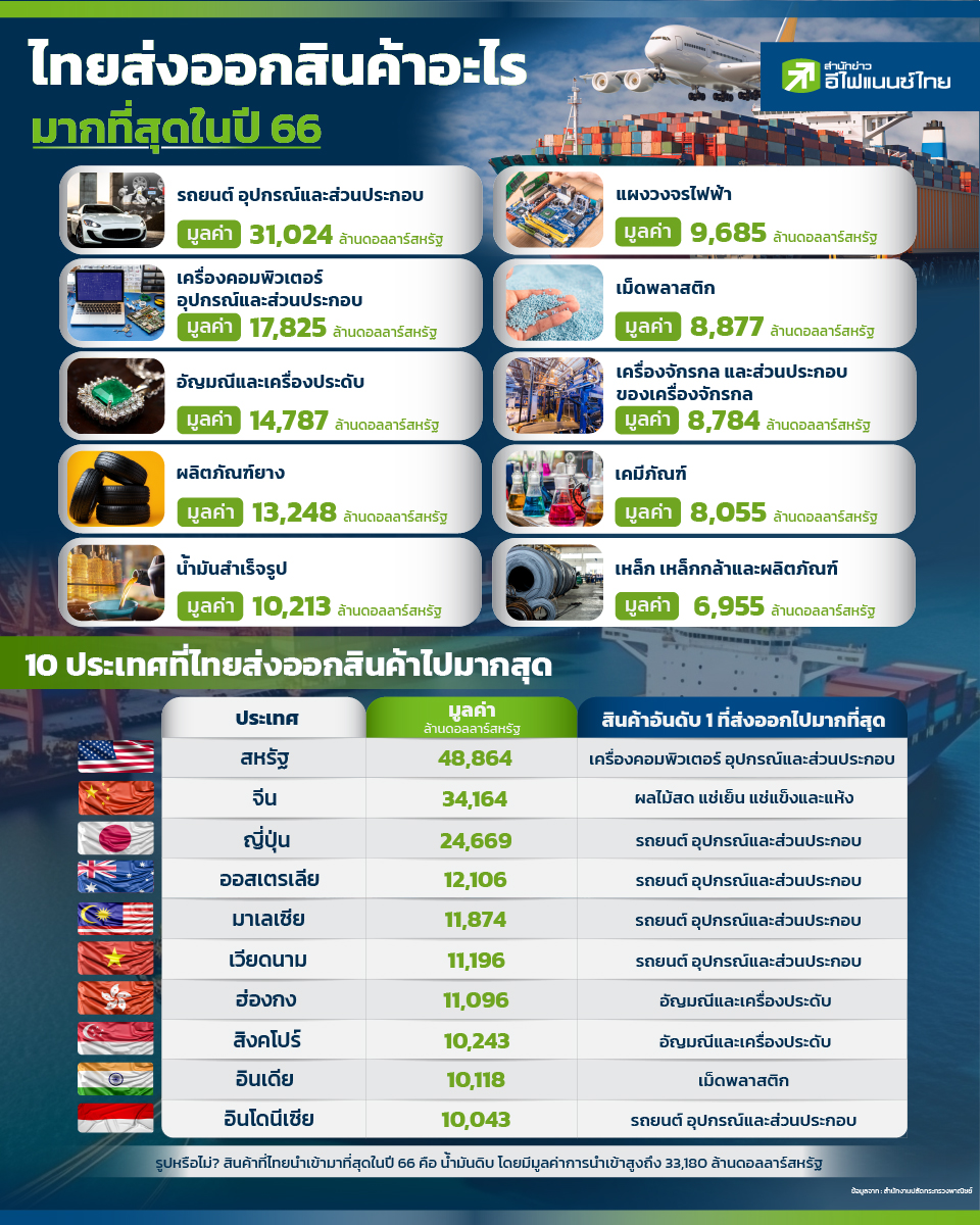 ในปี 66 ที่ผ่านมากระทรวงพาณิชย์ ได้ประกาศตัวเลขการส่งออกของไทย โดยพบว่า ติดลบ 1% โดยต้องยอมรับว่า ในปีที่ผ่านมา ภาคการส่งออกของไทยต้องเผชิญกับความท้าทายจากเศรษฐกิจประเทศคู่ค้าแล้ว ยังเจอกับปัญหาของสงครามรัสเซีย-ยูเครน การกีดกันทางการค้าของประเทศมหาอำนาจต่างๆ ทำให้การส่งออกของไทยทั้งปีติดลบในที่สุด โดยในวันนี้ "สำนักข่าวอีไฟแนนซ์ไทย" ได้ทำการรวบรวมสินค้าส่งออกของไทยในปีที่ผ่านมา 10 อันดับแรกที่มีมูลค่าการส่งออกมากที่สุด และ 10 ประเทศที่ไทยส่งออกมากที่สุด