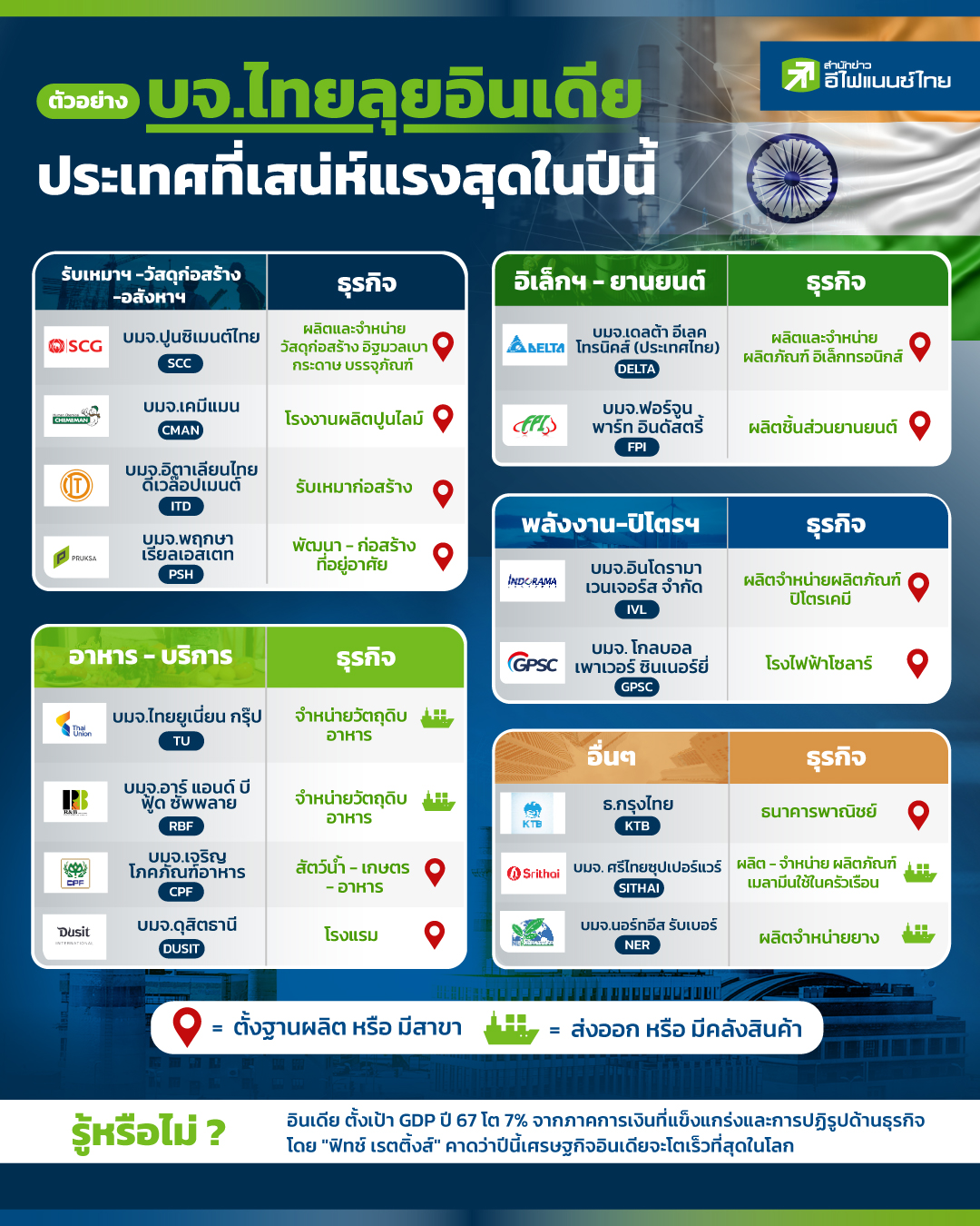 อินเดีย ถือเป็นประเทศที่น่าจับตามองการเติบโตของเศรษฐกิจเป็นอย่างมากในปีนี้ หลังจาก ธนาคารกลางอินเดียคาดการณ์ว่าจีดีพีของประเทศมีโอกาสเติบโตถึง 7% ในปีนี้ ขณะที่"ฟิทช์ เรตติ้งส์" คาดว่าปีนี้อินเดียจะเป็นหนึ่งในประเทศที่มีการขยายตัวทางเศรษฐกิจเร็วที่สุดในโลก . "สำนักข่าวอีไฟแนนซ์ไทย" จึงได้สำรวจบริษัทจดทะเบียนในตลาดหุ้นไทย พบว่ามีหลายธุรกิจที่เข้าไปรุกตลาดอินเดีย ประเทศที่กำลังเนื้อหอมที่สุดในเวลานี้กันบ้าง