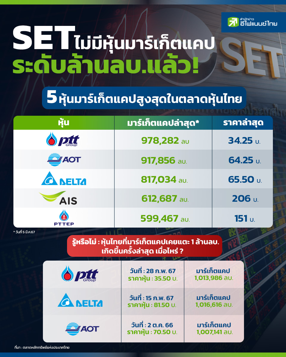 ตลาดหลักทรัพย์แห่งประเทศไทย (SET) มีหุ้นที่มีมูลค่ากิจการ หรือมาร์เก็ตแคปเกินระดับ 1 ล้านล้านบาท อยู่ 3 บริษัท ได้แก่ บมจ. ปตท. (PTT), บมจ. ท่าอากาศยานไทย (AOT) และบมจ. เดลต้า อีเลคโทรนิคส์ (ประเทศไทย) (DELTA) อย่างไรก็ตาม ด้วยภาวะตลาดหุ้นไทยที่ลดลงอย่างหนักตั้งแต่ปีที่ผ่านมา ส่งผลให้หุ้นทั้ง 3 บริษัทมีมูลค่าลดลงจะหลุดระดับ 1 ล้านล้านบาทลงมาหมดแล้ว "สำนักข่าวอีไฟแนนซ์ไทย" จึงได้รวบรวมหุ้น 5 อันดับแรกที่มีมาร์เก็ตแคปสูงสุด ณ ปัจจุบัน รวมถึงข้อมูลของ 3 หุ้นที่เคยติดอันดับ 1 ล้านล้านบาท