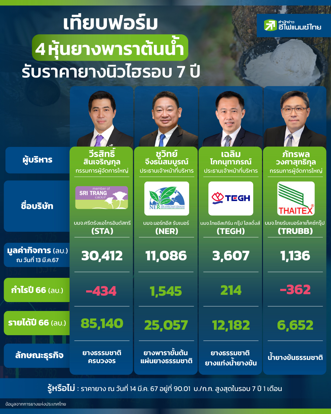 ราคายางในปัจจุบัน จากข้อมูล การยางแห่งประเทศไทย พบว่า ณ วันที่ 13 มี.ค. ที่ผ่านมา ราคาแตะไปอยู่ที่ 90.09 บาทต่อกิโลกรัม และทำยังพุ่งสูงขึ้นต่อเนื่องในวันที่ 14 มี.ค. ที่ผ่านมา โดยราคาสูงสุดอยู่ที่ 91.01 บาทต่อกิโลกรัม ซึ่งเป็นราคาสูงที่สุด หรือ ราคานิวไฮในรอบ 7 ปี โดยปัจจุบันมีบริษัทจดทะเบียน (บจ.) ในตลาดหลักทรัพย์แห่งประเทศไทย (ตลท.) ที่ทำธุรกิจตั้งแต่ยางต้นน้ำ ไปจนถึงปลายน้ำอยู่หลายบริษัท “สำนักข่าวอีไฟแนนซ์ไทย” ได้รวบรวมข้อมูล เทียบฟอร์ม 4 หุ้นยางราคาต้นน้ำว่า แต่ละบริษัทผลการดำเนินงานที่ผ่านมาเป็นอย่างไรบ้าง
