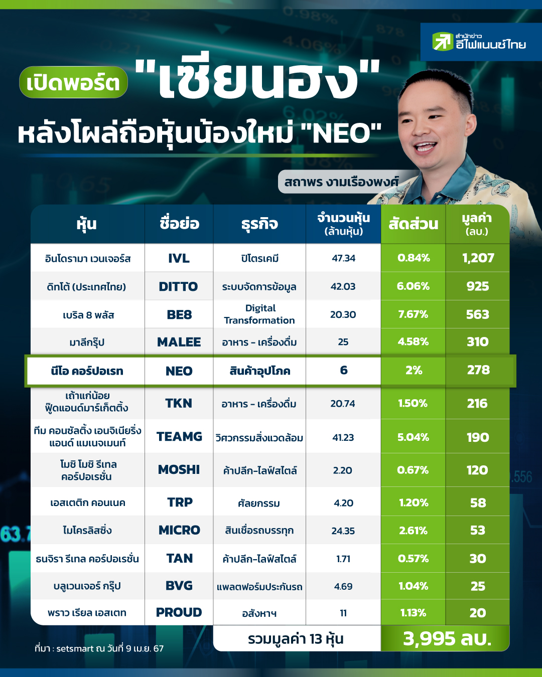 หลังจากหุ้นไอพีโอน้องใหม่ล่าสุดอย่าง "บมจ. นีโอ คอร์ปอเรท (NEO)" เข้ามาซื้อขายวันแรก เมื่อ 3 เม.ย.67 ที่ผ่านมา ซึ่งเมื่อเปิดดูรายชื่อผู้ถือหุ้นใหญ่ พบว่ามีนักลงทุนรายใหญ่ อย่าง สถาพร งามเรืองพงศ์ หรือ "เซียนฮง" นักลงทุนขาใหญ่ชื่อดังอยู่ในรายชื่อด้วย โดยชื่อของเซียนฮงอยู่ในอันดับ 6 มีหุ้นอยู่ 6 ล้านหุ้น หรือ 2% คิดเป็นมูลค่า 278 ล้านบาท (คิดจากราคาปิดในวันแรก) "สำนักข่าวอีไฟแนนซ์ไทย" จึงได้สำรวจว่า นอกจาก NEO แล้ว "เซียนฮง" ยังเป็นผู้ถือหุ้นรายใหญ่บริษัทใดบ้าง