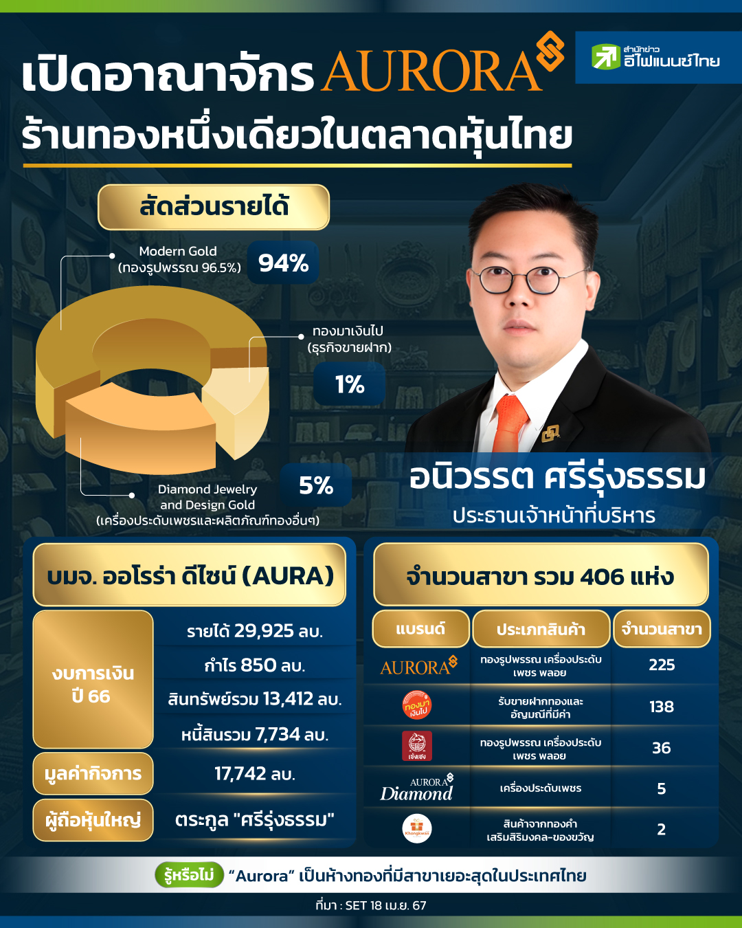 จากสภาวะปัญหาความขัดแย้งในตะวันออกกลาง สินทรัพย์ทองคำ ถือเป็นทางเลือกลงทุนที่นักลงทุนให้ความสนใจเป็นอย่างมาก ซึ่งรูปแบบการลงทุนทองคำมีหลากหลาย ทั้งการลงทุนทองคำแท่ง กองทุน หรือแม้แต่ทองรูปพรรณ โดยปัจจุบันมีบริษัทชั้นนำหลายแห่งที่ให้บริการลงทุนสินทรัพย์ดังกล่าว แต่มีบริษัทฯ เพียง 1 รายเท่านั้นที่จดทะเบียนในตลาดหุ้นไทย นั้นคือ บมจ. ออโรร่า ดีไซน์ (AURA) "สำนักข่าวอีไฟแนนซ์ไทย" จึงได้เปิดอาณาจักร ร้านทองหนึ่งเดียวในตลาดหุ้นไทย "AURORA" ถึงงบการเงินและแบรนด์ในเครือดังนี้