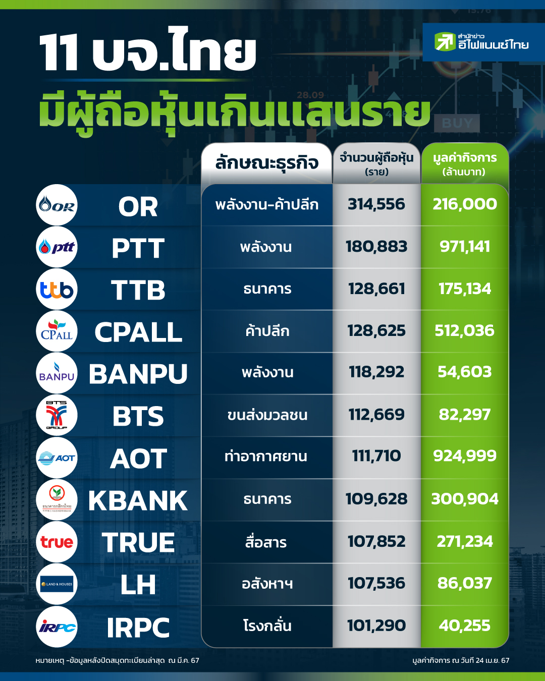ในปัจจุบัน พบว่า มีนักลงทุนจำนวนมากเข้ามาแสวงหาผลกำไร หรือ ผลตอบแทนด้านการลงทุนกับบริษัทจดทะเบียนในตลาดหลักทรัพย์ (ตลท.) ซึ่งส่วนใหญ่เห็นว่า นักลงทุน โดยเฉพาะรายย่อย ยังคงเลือกหุ้นที่จะลงทุนในบริษัทใหญ่ๆ เท่านั้น โดย “สำนักข่าวอีไฟแนนซ์ไทย” ได้ทำการสำรวจหุ้นในกลุ่ม SET100 พบว่า มีเพียง 11 บริษัทเท่านั้น ที่มีผู้ถือหุ้นทั้งหมดมากกว่า 100,000 รายขึ้นไป โดยมีบริษัทไหนบ้าง ได้รวบรวมไว้แล้ว