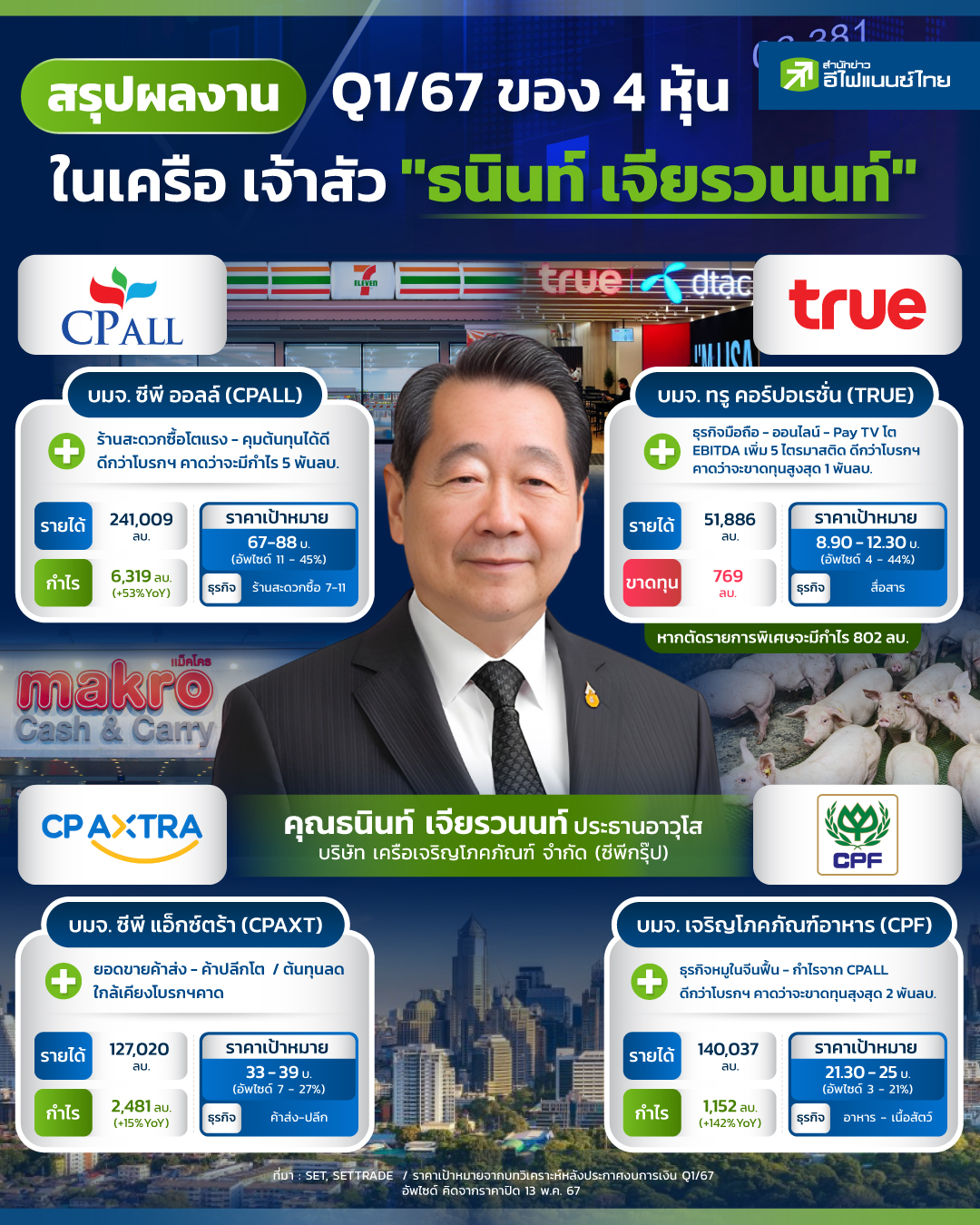 ผลประกอบการไตรมาส 1/67 ของผู้ประกอบธุรกิจสินค้าอุปโภค - บริโภครายใหญ่ของไทย อย่างกลุ่มบริษัท เครือเจริญโภคภัณฑ์ จำกัด (ซีพีกรุ๊ป) ของเจ้าสัว "ธนินท์ เจียรวนนท์" ที่อยู่ในตลาดหลักทรัพย์ ล่าสุดประกาศออกมาครบหมดแล้ว "สำนักข่าวอีไฟแนนซ์ไทย" จึงรวบรวมข้อมูลผลการดำเนินงานไตรมาส 1/67 ของทั้ง 4 บริษัท ได้แก่ บมจ. ซีพี ออลล์ (CPALL) ผู้ทำธุรกิจร้านสะดวกซื้อ 7-eleven , บมจ. เจริญโภคภัณฑ์อาหาร (CPF) ผู้ผลิตอาหาร-เนื้อสัตว์ , บมจ. ซีพี แอ็กซ์ตร้า (CPAXT) ผู้ทำธุรกิจค้าปลีก - ส่ง แบรนด์ Lotus's