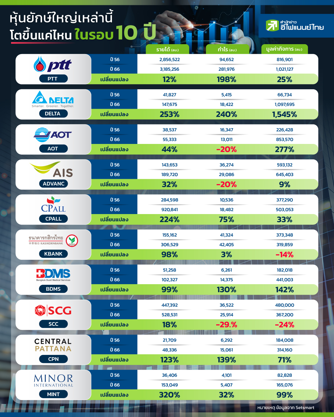 ในช่วง 10 ปีที่ผ่านมา พบว่า สถานการณ์ทั้งในและต่างประเทศมีหลากหลายปัจจัยที่เข้ามาท้าทายในการดำเนินธุรกิจที่จดทะเบียนในตลาดหลักทรัพย์ (ตลท.) จำนวนมาก ไม่ว่าจะเป็นสงครามการค้า สถานการณ์การแพร่ระบาดของไวรัสโควิด-19 ที่ทำให้ภาคธุรกิจต้องปรับตัวเป็นอย่างมาก โดยในวันนี้ “สำนักข่าวอีไฟแนนซ์ไทย” ได้ทำการรวบรวม 10 หุ้น โดยคัดจากหุ้นที่อยู่อยู่ใน SET50 และมีมูลค่ากิจการสูงในแต่ละอุตสาหกรรมมาให้นักลงทุนได้ดูกันว่า ในช่วง 10 ปีที่ผ่านมา หุ้นเหล่านี้เติบโตมากน้อยแค่ไหน ทั้งในแง่ของรายได้ กำไร