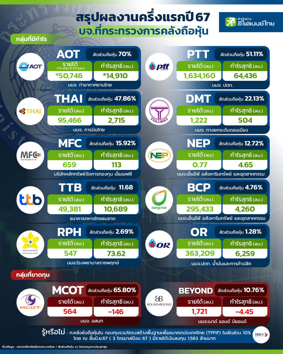 หลังจากมีข่าว "กระทรวงการคลัง" เตรียมปรับพอร์ตการลงทุนครั้งใหญ่ เพื่อลดการถือหุ้นในบริษัททั้งในและนอกตลาดหุ้น ที่ไม่ค่อยได้สร้างรายได้ "สำนักข่าวอีไฟแนนซ์ไทย" จึงพาไปสำรวจผลงานครึ่งแรกปี 67 ของ 12 บริษัทจดทะเบียน และ 1 กองทุนโครงสร้างพื้นฐาน ในตลาดหลักทรัพย์แห่งประเทศไทยที่ถือโดยชื่อของ กระทรวงการคลัง โดยตรง โดยพบว่าเป็นกลุ่มที่มีกำไรสุทธิจำนวน 10 บริษัท และกลุ่มที่ขาดทุนอีกจำนวน 2 บริษัท * ทั้งนี้ ข้อมูลดังกล่าวยังไม่รวมหุ้นที่กระทรวงการคลังถือผ่านกองทุนวายุภักษ์ ซึ่ง ณ สิ้นปี