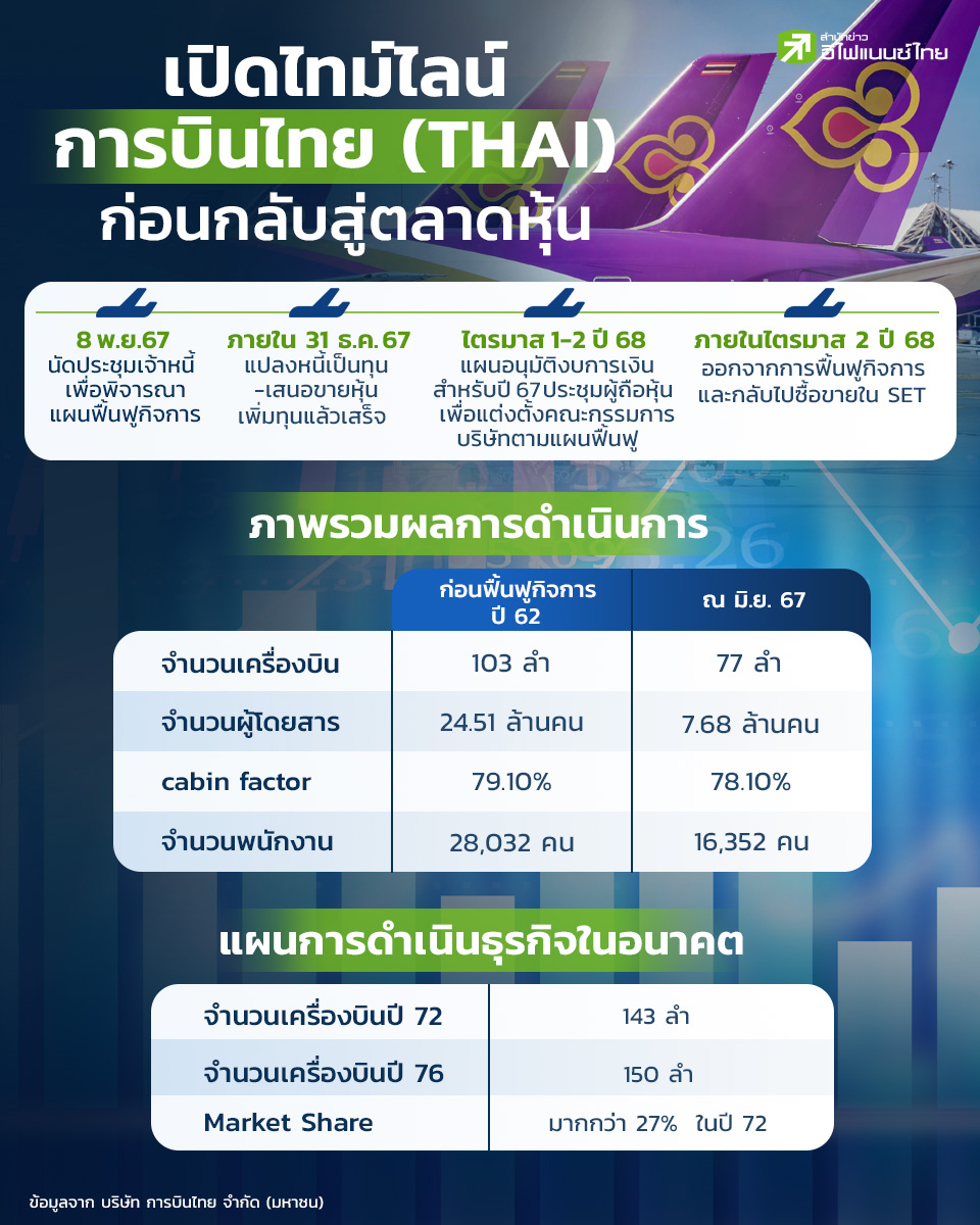 เมื่อเร็วๆนี้ บริษัท การบินไทย จำกัด (มหาชน) หรือ THAI ได้ประกาศเส้นทางสู่การเติบโตที่ต่อเนื่อง และยั่งยืนภายใต้แนวคิด “Fly for The New Pride” สู่ขอบฟ้าใหม่แห่งความภูมิใจ เพื่อสร้างความแข็งแกร่ง หลังจากที่ผ่านพ้นช่วงเวลาของการฟื้นฟูกิจการเรียบร้อยแล้ว และพร้อมที่จะกลับเข้ามาซื้อ-ขายในตลาดหุ้นไทยอีกครั้ง โดยในวันนี้ "สำนักข่าวอีไฟแนนซ์ไทย" ได้รวบรวมไทม์ไลน์ ของ THAI ก่อนที่จะกลับสู่ตลาดหุ้นอีกครั้ง จะเป็นอย่างไรบ้าง และจะกลับมาซื้อขายได้ในช่วงเวลาใด ได้รวบรวมไว้ที่นี่แล้ว