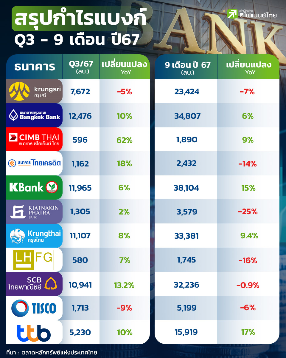 ภาพรวมผลงานของธนาคารพาณิชย์รวม 11 บริษัท ในไตรมาส 3/67 ส่วนใหญ่ปรับตัวเพิ่มขึ้นเนื่องจากรับรู้รายได้ดอกเบี้ยที่เพิ่มขึ้น อย่างไรก็ตามเมื่อพิจารณาผลงาน 9 เดือนแรกพบว่า มีหลายบริษัทที่ผลกำไรปรับตัวลดลงเมื่อเทียบกับช่วงเดียวกันปีก่อน เนื่องจากการตั้งสำรองหนี้เสียเพิ่มมากขึ้น สำนักข่าว "อีไฟแนนซ์ไทย" จึงได้รวบรวมข้อมูล ผลกำไรทั้งไตรมาส 3/67 และงบ 9 เดือน ทั้ง 11 แบงก์พาณิชย์ ไว้ดังนี้