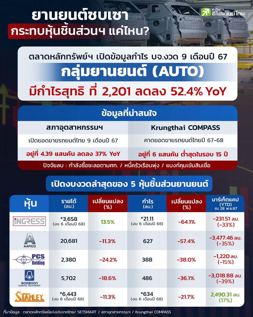 ปีนี้แนวโน้มธุรกิจยานยนต์น่าจะอยู่ในช่วงขาลง หลังได้รับผลกระทบจากกำลังซื้อที่ชะลอ ภาวะหนี้ครัวเรือนพุ่งสูงขึ้น รวมถึงการคุมเข้มการปล่อยสินเชื่อของภาคธนาคารพาณิชย์ โดยล่าสุดสภาอุตสาหกรรมแห่งประเทศไทย (ส.อ.ท.) ก็ได้มีปรับลดเป้าการผลิตรถยนต์ปี 67 เป็น 1.5 ล้านคัน จาก 1.7 ล้านคัน หรือลดลงกว่า 200,000 คัน นอกจากนี้ข้อมูลจากตลาดหลักทรัพย์ฯ พบว่ารายงานกำไรสุทธิของกลุ่มยานยนต์ (AUTO) ช่วง 9 เดือนแรกของปีนี้มีกำไรสุทธิเพียง 2,201 หรือลดลง 52.4% จากช่วงเดียวกันของปีก่อน ทั้งนี้ "สำนักข่าวอีไฟแนนซ์ไทย"