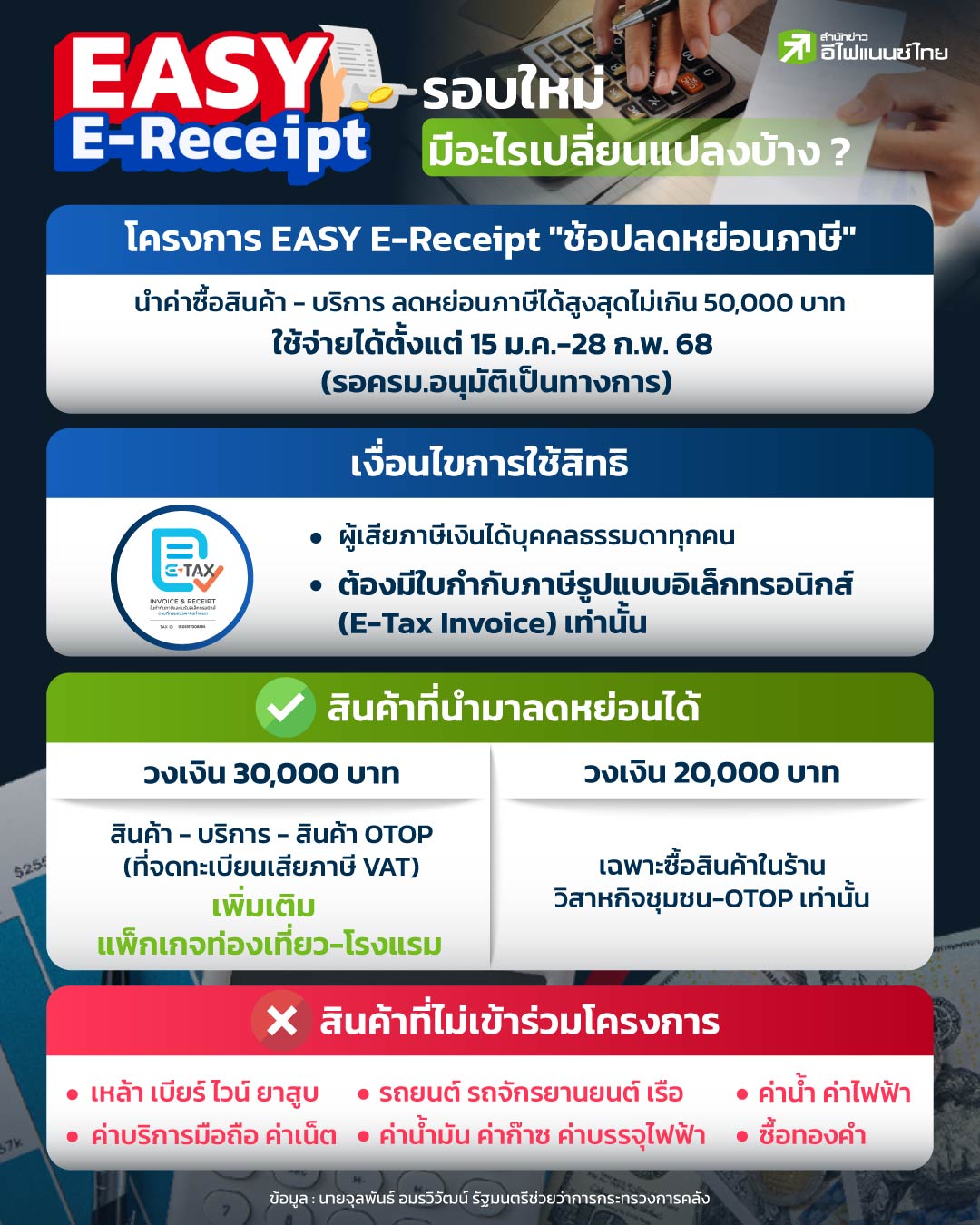 ในที่สุดมาตรการที่หลายคนรอคอยก็ใกล้จะได้เกิดขึ้นแล้ว เมื่อล่าสุด นายพิชัย ชุณหวชิร รองนายกรัฐมนตรีและรัฐมนตรีว่าการกระทรวงการคลัง ออกมาระบุว่า เตรียมจะเข้าครม.ในวันที่ 24 ธ.ค.นี้ จนล่าสุด นายจุลพันธ์ อมรวิวัฒน์ รมช.คลัง ได้เปิดรายละเอียดของโครงการแบบหมดเปลือก ว่าสินค้าอะไรใช้ได้ ใช้ไม่ได้ วงเงินเท่าไหร่ คาดการณ์ช่วงเวลาที่จะใช้ได้ โดยวันนี้ “สำนักข่าวอีไฟแนนซ์ไทย” ได้ทำการรวบรวมว่าโครงการ EASY E-Receipt รอบใหม่จะมีอะไรที่เปลี่ยนแปลงไปจากเดิมบ้าง