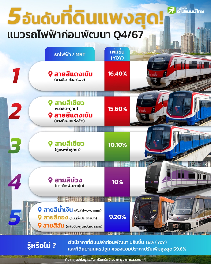 5 อันดับที่ดินแพงสุด! แนวรถไฟฟ้าก่อนพัฒนา Q4/67