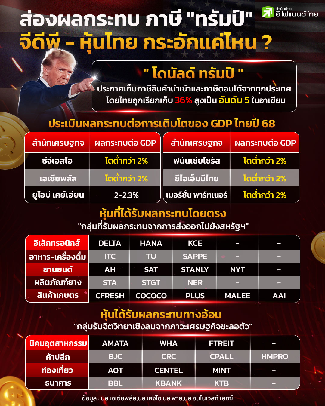 ทันทีที่ นายโดนันท์ ทรัมป์ ประธานาธิบดีสหรัฐ ประกาศ เก็บภาษีพื้นฐาน (Baseline tariff) สำหรับสินค้านำเข้าจากทุกประเทศ ในอัตรา 10% และภาษีตอบโต้ (Reciprocal tariff) กับอีกหลายสิบประเทศ รวมถึงคู่ค้ารายใหญ่ของสหรัฐ ด้านไทยโดน 36% ติดอันดับ 5 ในอาเซียน ที่ถูกเรียกเก็ยภาษีสูงสุด ส่งผลให้กระทรวงการคลัง ต้องเรียกหน่วยงานที่เกี่ยวข้องประชุมด่วน เพื่อหาแนวทางในการรับมือ รวมถึงหามาตรการรองรับกับผลกระทบที่อาจจะเกิดขึ้นกับเศรษฐกิจ ผู้ประกอบการ และประชาชน ขณะที่หน่วยงานด้านเศรษฐกิจ เริ่มออกมาแสดงความกังวลถึงผลกระทบที่จะมีต่อภาพการส่งออก
