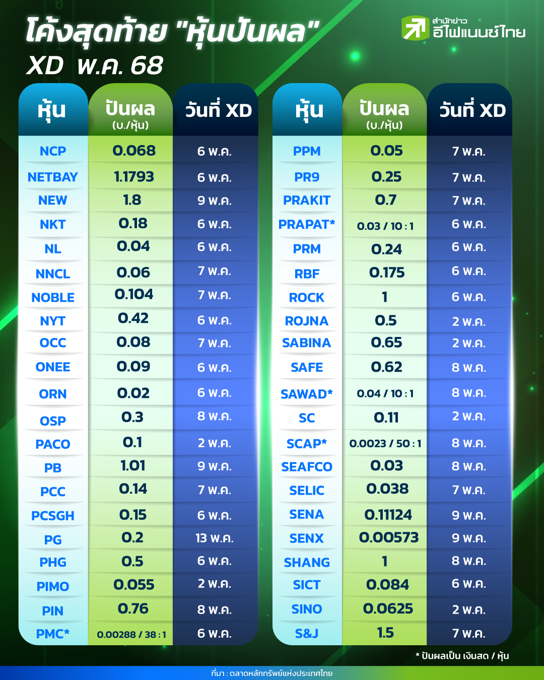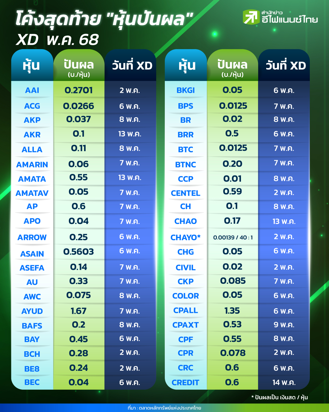 ตลาดหุ้นไทยเริ่มเข้าสู่ช่วงโค้งสุดท้ายของฤดูกาลการจ่ายปันผล (ขึ้น XD) ของบริษัทจดทะเบียนในตลาดหลักทรัพย์ฯในงวดปี 67 เพราะในช่วงเดือนพ.ค.ของทุกปี มักมีการประกาศขึ้นเครื่องหมาย XD จำนวนมาก โดยสำหรับเดือนพ.ค.68 นี้ ก็ยังคงมีหุ้นที่ขึ้น XD ถึง 168 บริษัท อย่างไรก็ตามแม้ในภาวะที่เศรษฐกิจยังเต็มไปด้วยความไม่แน่นอน แต่หลายบริษัทก็ยังไม่ลืมแบ่งปันผลตอบแทนให้กับผู้ถือหุ้นอย่างต่อเนื่อง "สำนักข่าวอีไฟแนนซ์ไทย" จึงได้รวบรวมข้อมูล บริษัทจดทะเบียนที่ประกาศขึ้น XD ในเดือนพ.ค.68 เพื่อให้นักลงทุนสายปันผลหาหุ้นได้ง่ายขึ้น