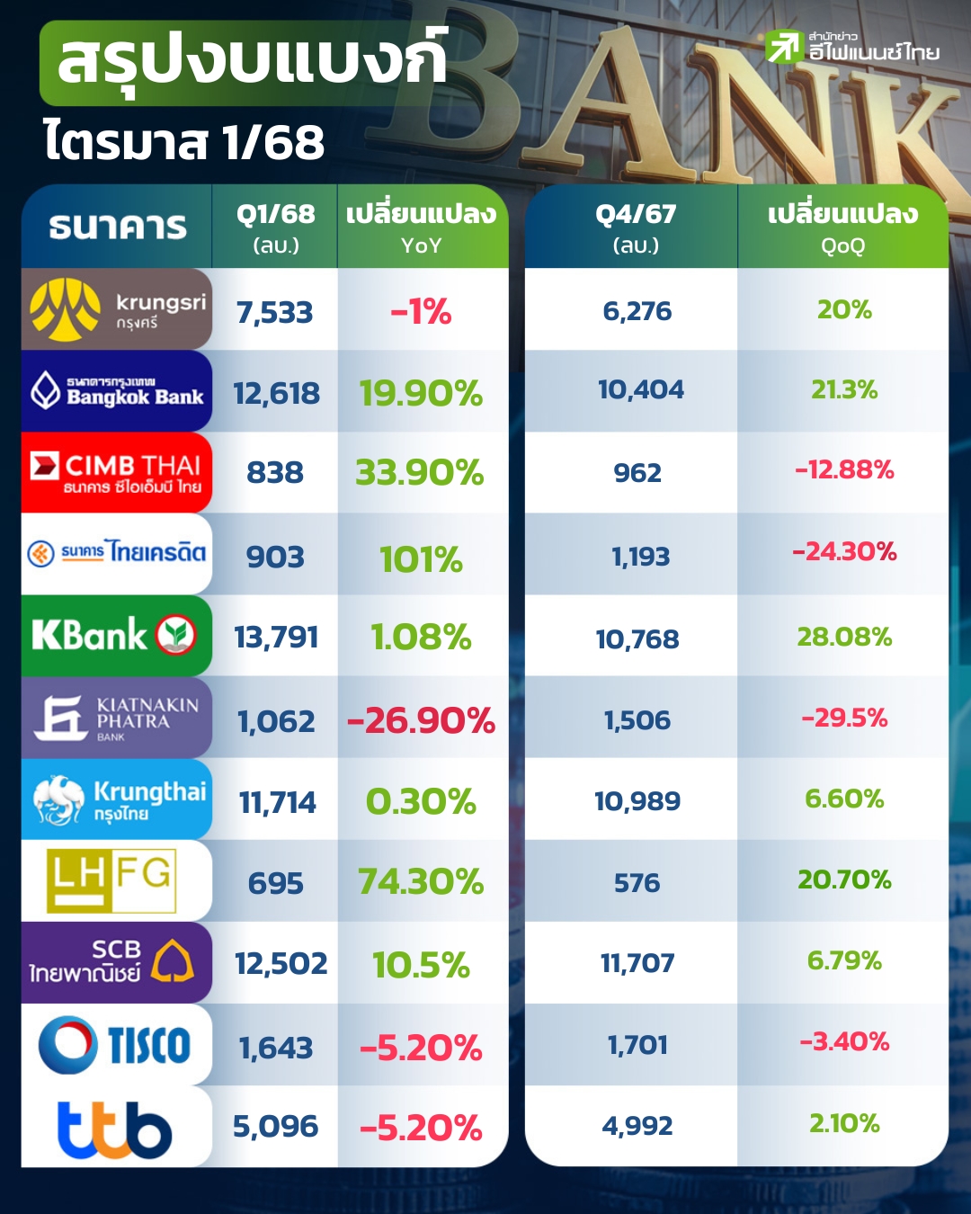 กลุ่มธนาคารพาณิชย์ ปั๊มกำไรไตรมาส 1/68 อยู่ที่ 68,395 ล้านบาท เพิ่มขึ้น 6.93% จากไตรมาส 1/67 ที่อยู่ที่ 63,959 ล้านบาท พบ KBANK ทำกำไรสูงสุดที่ 13,791 ล้านบาท ส่วน KKP กำไรลดลงแรง 29.5% อยู่ที่ 1,061.62 ล้านบาท ขณะที่สินเชื่อส่วนใหญ่พบว่าชะลอตัว ผู้สื่อข่าว “อีไฟแนนซ์ไทย” ได้รวบรวมผลประกอบการไตรมาส 1/68 ของกลุ่มธนาคารพาณิชย์ 11 แห่ง พบว่า สามารถทำกำไรรวมได้ 68,395 ล้านบาท เพิ่มขึ้น 6.93% จากช่วงเดียวกันปีก่อนที่มีกำไรรวม 63,959 ล้านบาท โดยงวดนี้พบว่าธนาคารไซส์เล็ก สามารถทำกำไรมีอัตราเติบโตสูง