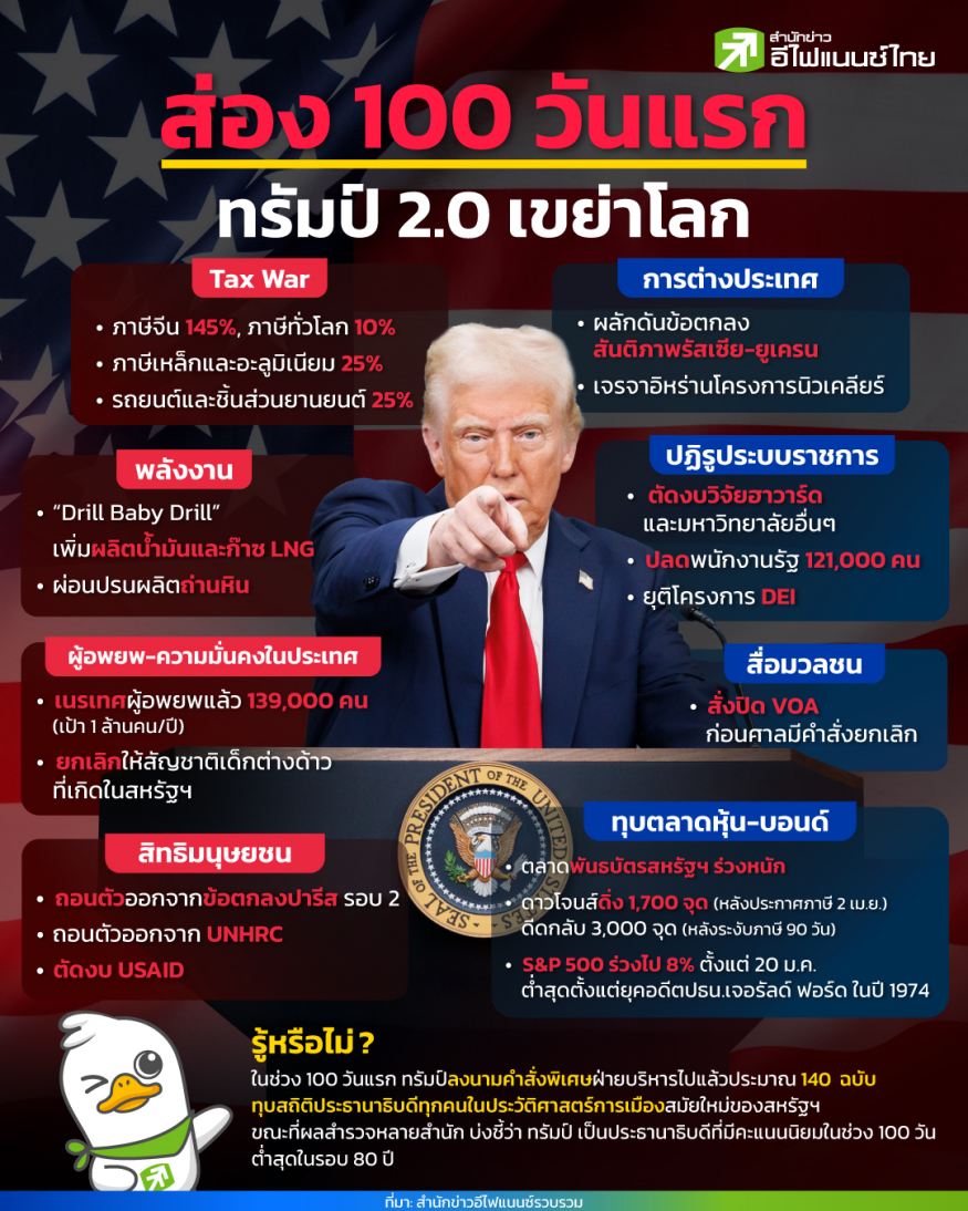 การประกาศผลงานในช่วง 100 วันแรกของผู้นำสหรัฐฯ กลายเป็นธรรมเนียมปฏิบัติเรื่อยมาตั้งแต่สมัยแฟรงคลิน ดี. โรสเวลต์ ประธานาธิบดีคนที่ 32 ของสหรัฐฯ ในปี 1933 ซึ่งในช่วงนั้น มีการระดมออกกฎหมายหลายฉบับ ที่มุ่งปฏิรูประบบธนาคาร ตลาดแรงงาน และภาคการเกษตร ภายใต้โครงการนิวดีล (New Deal) เพื่อบรรเทาผลกระทบจากภาวะเศรษฐกิจตกต่ำครั้งใหญ่ (Great Depression) ที่เริ่มขึ้นในปี 1929 ผ่านไปเกือบหนึ่งศตวรรษ อเมริกาเดินทางมาถึงช่วง 100 วันของการกลับมาดำรงตำแหน่งสมัยที่ 2 ของ “โดนัลด์ ทรัมป์” ประธานาธิบดีคนที่