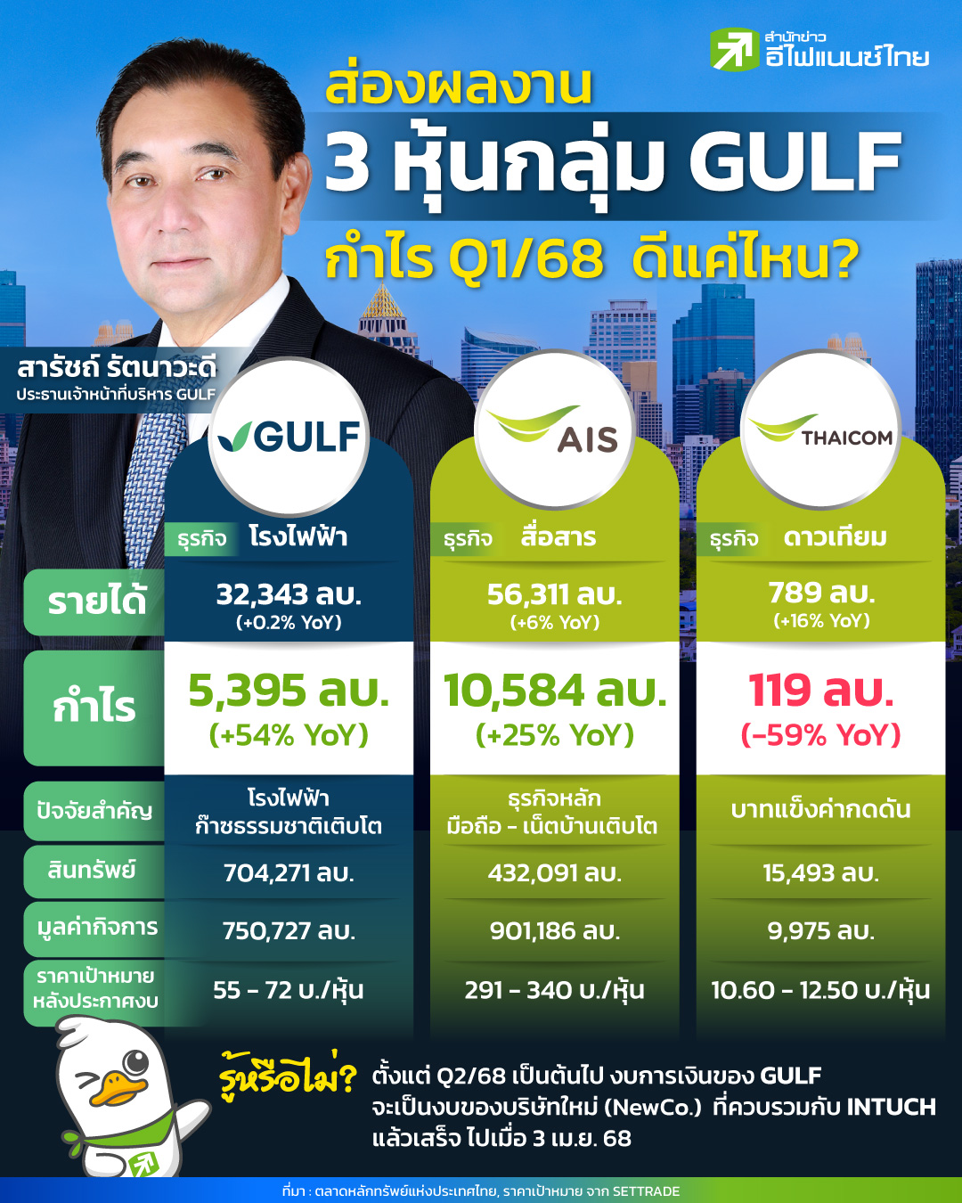 หลังจาก บริษัท กัลฟ์ เอ็นเนอร์จี ดีเวลลอปเมนท์ จำกัด (มหาชน) หรือ GULF ดำเนินการควบรวมกิจการกับ บริษัท อินทัช โฮลดิ้งส์ จำกัด (มหาชน) หรือ INTUCH สำเร็จเรียบร้อย พร้อมกลับเข้าซื้อขายในตลาดหลักทรัพย์ด้วยชื่อใหม่อย่างเป็นทางการว่า GULF ส่งผลให้ GULF ขยับขึ้นมาเป็นหนึ่งในเครือธุรกิจที่มีอิทธิพลมากที่สุดในตลาดหุ้นไทย ส่งผลให้ปัจจุบันเครือ GULF มีบริษัทในตลาดหลักทรัพย์รวม 3 แห่ง ประกอบด้วย GULF ทำธุรกิจพลังงานและโครงสร้างพื้นฐาน, บริษัท แอดวานซ์ อินโฟร์ เซอร์วิส จำกัด (มหาชน) หรือ ADVANC (AIS) ผู้ให้บริการโทรคมนาคมของไทย