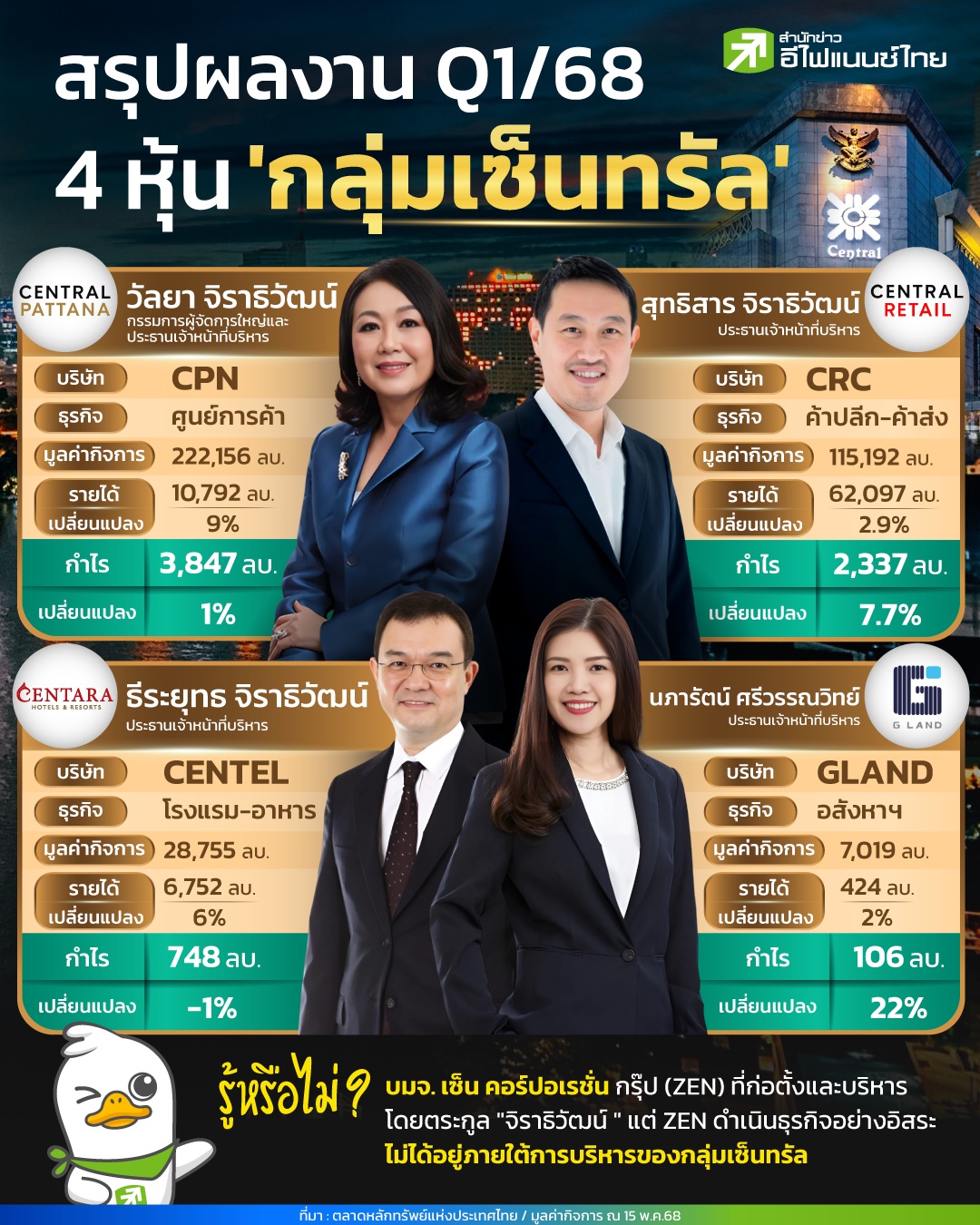 ไตรมาสแรกของปี 68 “กลุ่มเซ็นทรัล” ยืนยันสถานะผู้นำธุรกิจค้าปลีก-อสังหาฯ-บริการของไทย ด้วยผลงานสุดแกร่งจาก 4 บริษัทในเครือที่ทยอยโชว์งบกำไรโตถ้วนหน้า สะท้อนการฟื้นตัวของเศรษฐกิจไทย และการจับจ่ายของผู้บริโภคที่เริ่มกลับมา แม้เศรษฐกิจโดยรวมยังเผชิญความท้าทาย แต่กลุ่มเซ็นทรัลกลับไม่สะดุด โดยบริษัทย่อย 4 แห่งในตลาดหลักทรัพย์ฯ ต่างปล่อยงบไตรมาส 1/68 มาอย่างโดดเด่น ทั้ง บมจ.เซ็นทรัลพัฒนา (CPN),บมจ.เซ็นทรัล รีเทล คอร์ปอเรชั่น (CRC),บมจ.โรงแรมเซ็นทรัลพลาซา (CENTEL) และ บมจ.แกรนด์ คาแนล แลนด์ (GLAND)